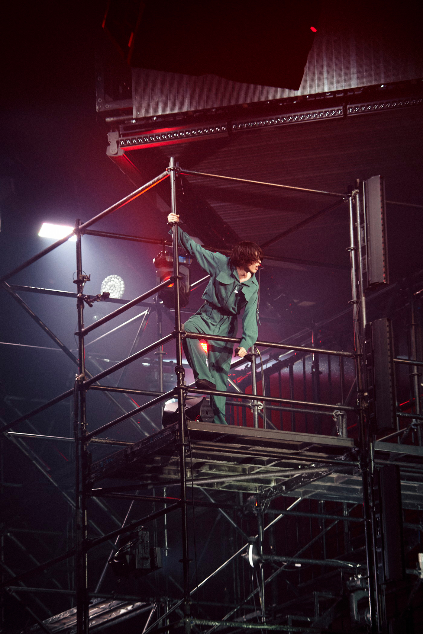 そして勢いのままに投下された「KICK BACK」で、会場の一体感と熱気は最高潮に。真っ赤な明かりがついた瞬間、3階建ての鉄骨セットでは多数のダンサーが囚われた獣のような荒ぶる動きを見せ、舞台のあちこちからはファイヤーボールが何度も噴き上がる。
