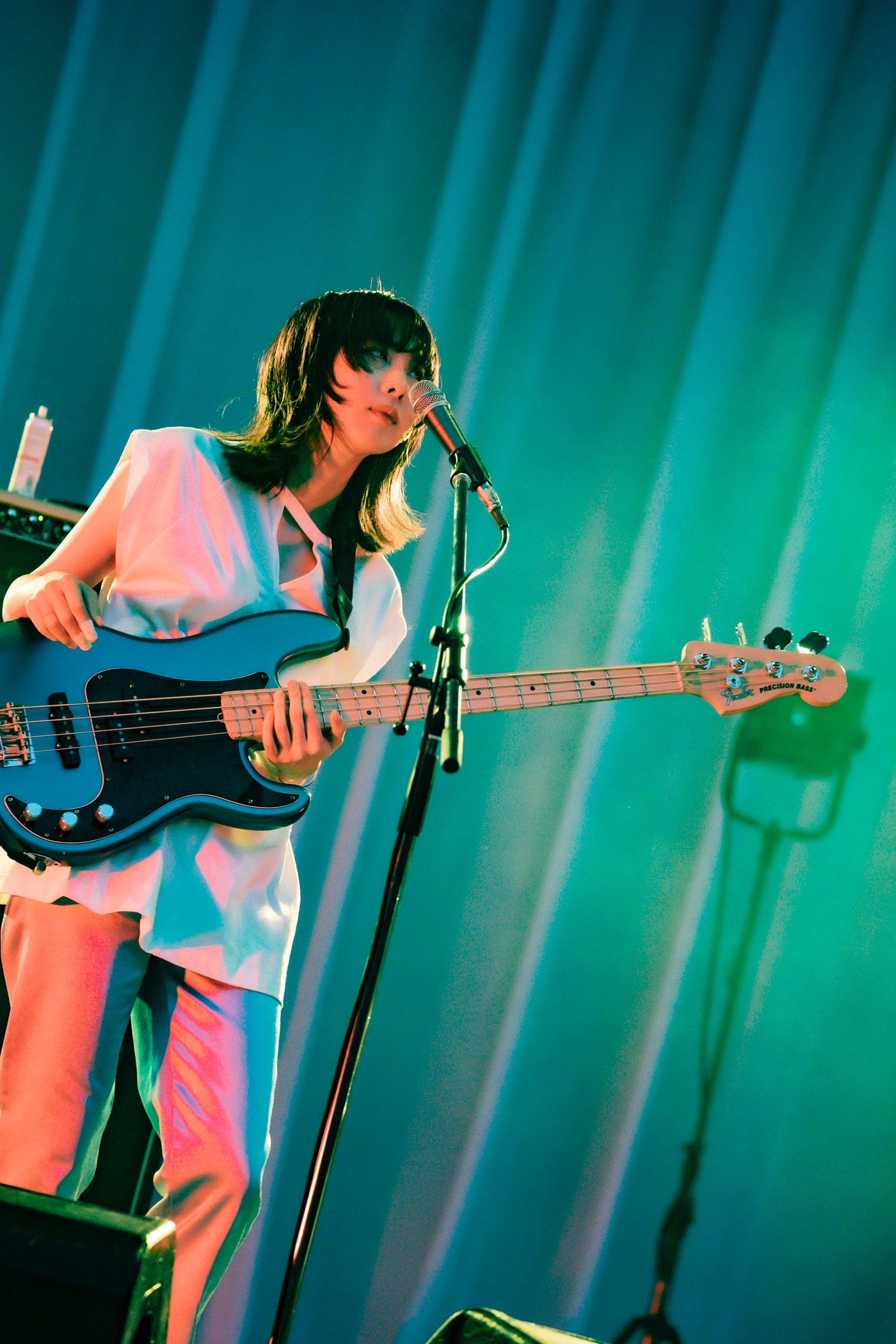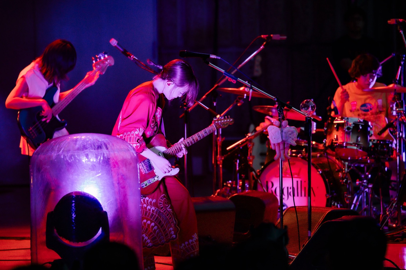 リーガルリリーの3人が静かにステージに降り立つと、「ばかばっかのせんじょうに ギターをひとつ持って」と、たかはしほのか(Vo&Gu)の歌い出しから始まる「ジョニー」を演奏。ライブでの声出しが解禁になったこともあり、観客の熱量もよりいっそう高く、そのままなだれ込むように「たたかわないらいおん」へ。次に演奏された新曲「ハイキ」では、海(Ba)が銅鑼を叩くと同時に、軽やかなバンドのグルーヴが構築されていく。