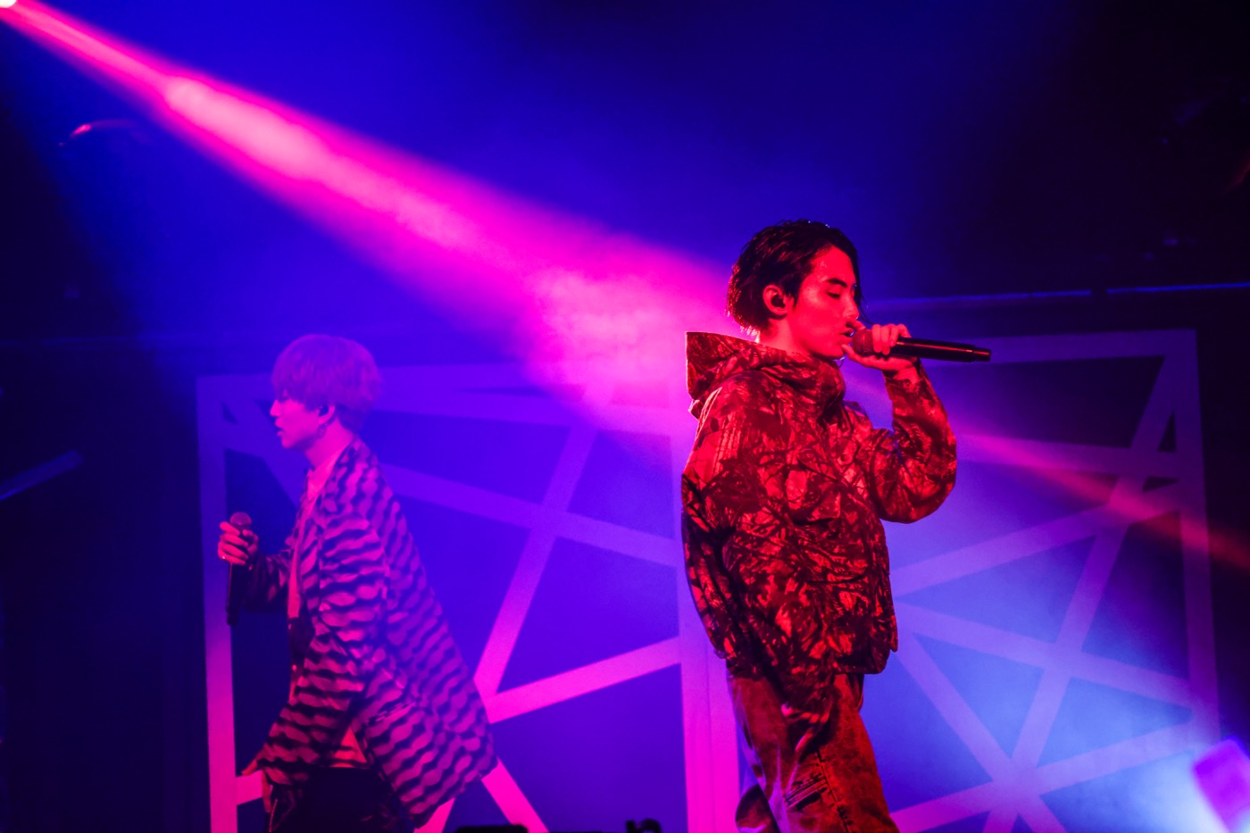 「ブチ上がる準備できてますか? 最高の夜、作ってこうぜ」というジャンの号令から、「Are U Ready?」のストレートなラップ&ボーカルでBLUEのテンションを徐々に引き上げ準備万端整えると、ここから9人が3組に分かれてあらたなユニット曲をお披露目。トップバッターを飾ったのは、ファンから“相棒”というコンビ名で呼ばれる20歳の池田彪馬と19歳の松村和哉による「Do It」だ。