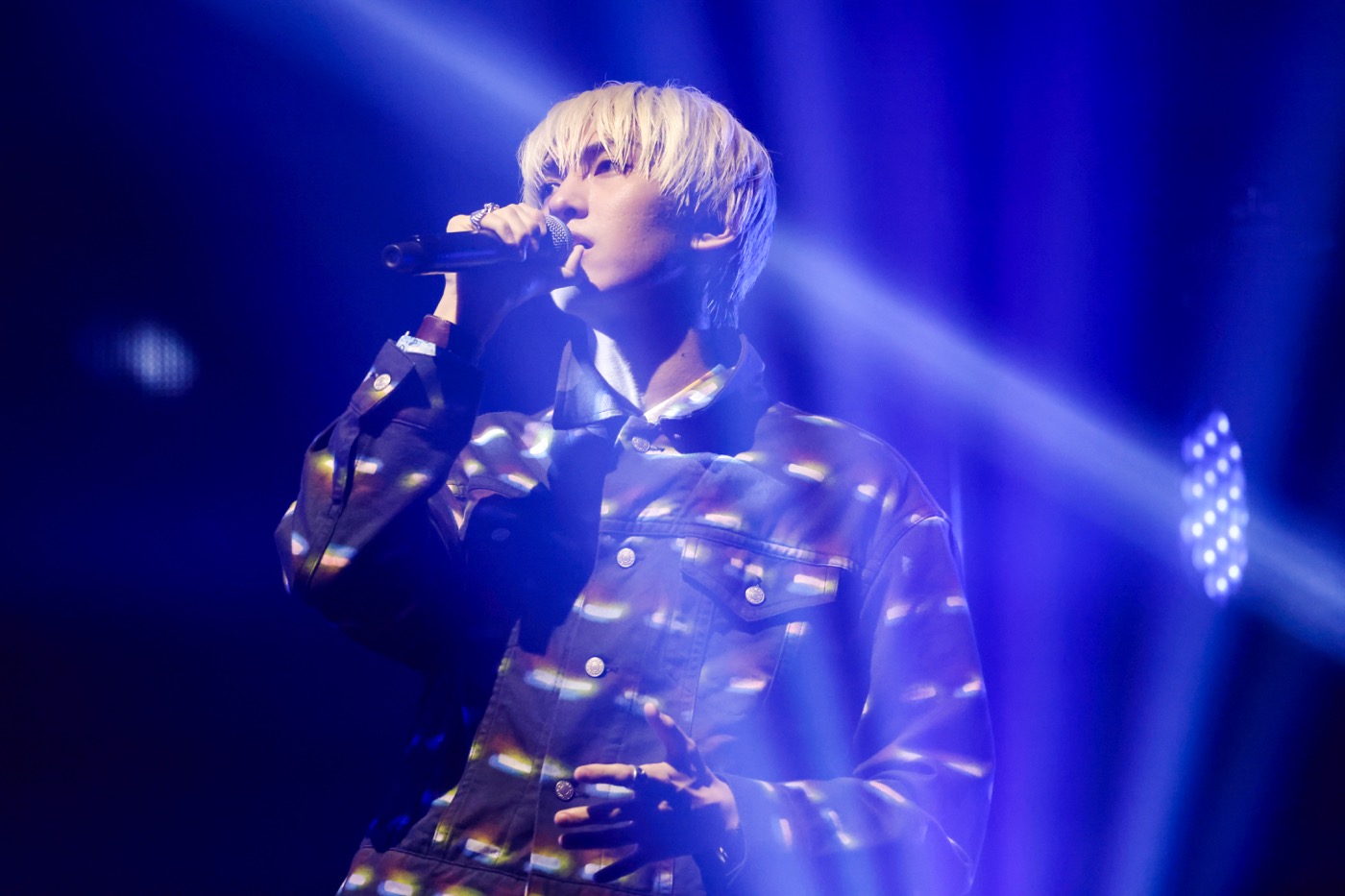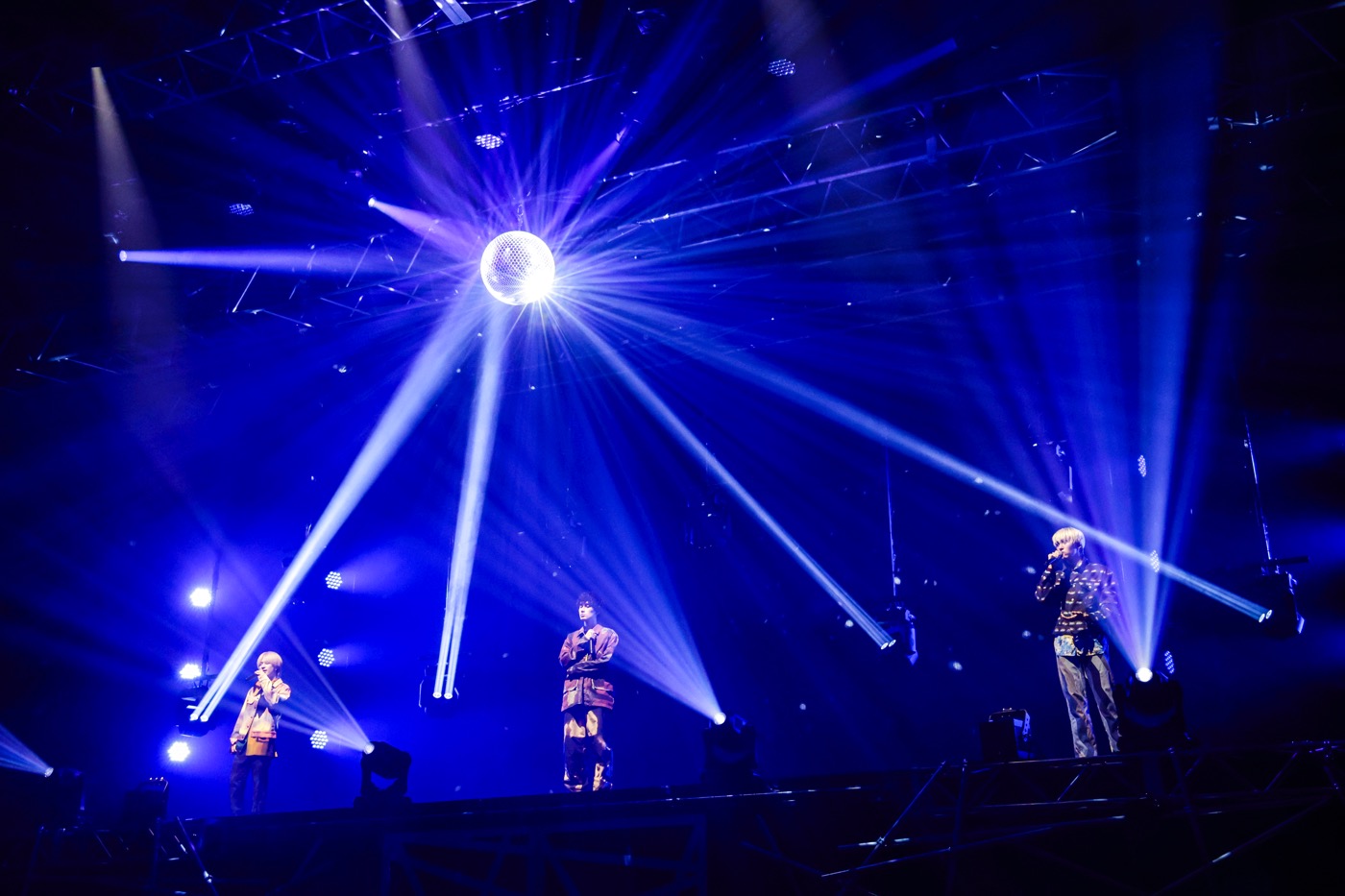 一転、壇上でアコースティックバラード「maybe it’s you」をしっとり歌い上げたのは古川毅、ジャン海渡、田中洸希の3人だ。アグレッシブなラッパーイメージの強いジャンとバラードの取り合わせは意外だが、それだけに貴重で、BLUEもステージに全集中。君への想いを綴るエモーショナルな歌声が輝くミラーボールに共鳴して、いっそう切なさを際立たせていく。