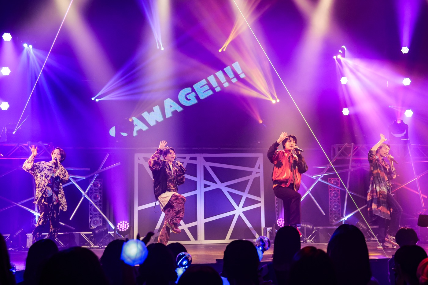 続いて、伊藤壮吾の車掌アナウンスから始まったのは、志村玲於、飯島颯、伊藤、柴崎楽のダンサー陣が初めて4人でハンドマイクを取った「SAWAGE!!!!」。“お茶の子さいさい”“参勤交代”といったワードが登場し、コミカルな色の強い和風お祭りトンチキソングは、志村いわく「爆笑しながら振り付けした」とのことで、お神輿代わりに飯島が担ぎ上げられる場面もあった。ちなみにジャンと松村が手掛けた歌詞には志村の紅茶、柴崎の料理など、メンバーにまつわる要素もしっかり盛り込まれており、ジャンの自宅で行った作曲の様子も「いつか(映像を)公開したい」(松村)とのこと。また、伊藤の“君の瞳に乾杯”、柴崎の“子猫ちゃん”というキメ台詞には黄色い悲鳴の嵐が吹き荒れたが、大阪公演では「レコーディングでの和哉の“子猫ちゃん”のこだわりがすごかった」という秘話も柴崎から明かされたので、リリースを楽しみにしたい。