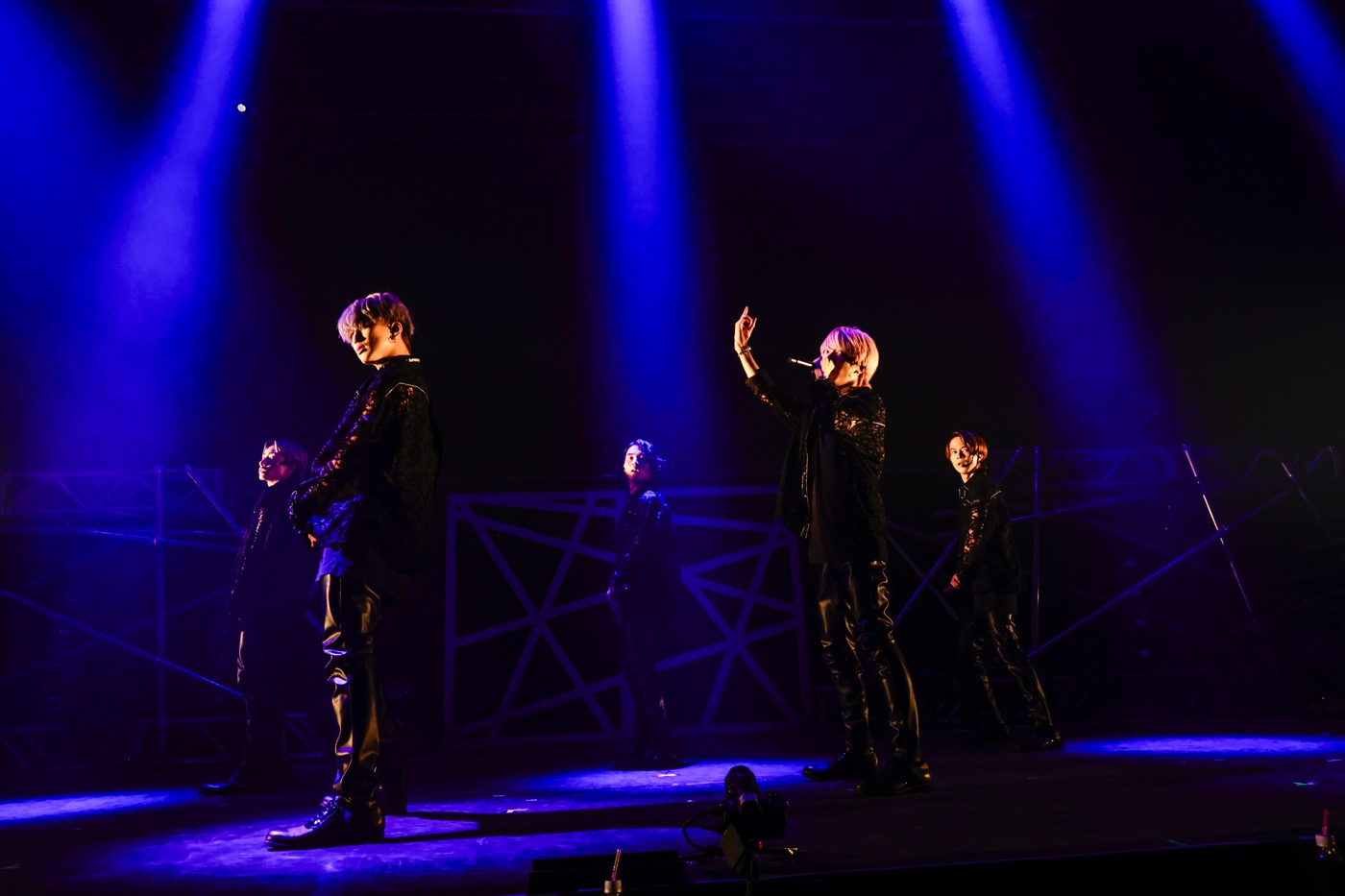 すかさず上手にジャン海渡、下手に松村和哉が現れて切れ味鋭いラップを繋げば、センターの扉が開いてダンサー4人が飛び出し、下手から池田彪馬、上手の壇上から田中洸希とボーカル陣が加わる鮮烈なオープニングで、BLUEの眼を釘付けにする。噴き出す火花の助けも借りながら、グループ内それぞれの役割を明確にアピールしたところで、色っぽい表情で魅了する「Monster!」に勢いよくBLUEを煽る「SWEET DEVIL」と、タイプの異なる人気シングル曲を連投。ステージ後方の大型モニターにはリアルタイムのパフォーマンスが映し出されるが、古川のプロデュースによるカラフルでゴージャスな衣装に身を包んだ9人はどの瞬間、誰を切り取ってもキマッており、グループカラーである青のライトスティックを振るBLUEの狂乱も納得だ。