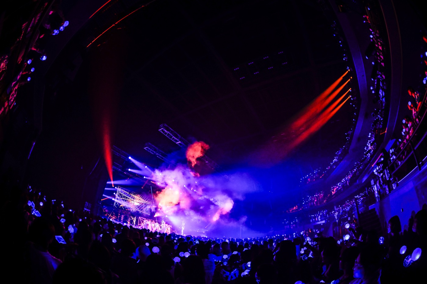 その上で、BLUEとの距離を心身ともに縮めていくことも忘れない。ピュアな恋心を歌う「Pretty Girl」ではメンバーが客席に下りて方々に散らばり、BLUEたちと間近でコミュニケーション。スタンド席へと通じる階段を上がり、上方階のオーディエンスにも満面の笑顔で爽快なハッピーを届けていく。そこから夕焼け色の照明の下、ラップも歌声もすべてが温かな「Distance」では、今度は“いつだって心は側にいる”とアピール。それに応えて客席一面で揺れる青い光が、彼らの想いを確かに受け取ったことを表していた。