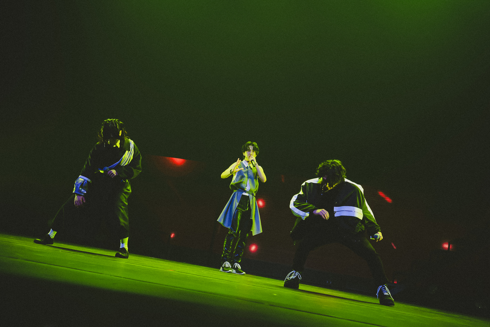 転換時には真音と凛が各グループの魅力を語るナレーションが流されたが、Anelaのバックダンサーを務めていた3人によって結成されたLEGITにはエモーショナルな演出が用意されていた。巨大スクリーンには、凛が「あとは頼んだよ」と大毅にマイクを託す最終話の映像が流れ、そのマイクを受け取った助川真蔵(高尾大毅)と森蔭晨之介(二条瑛士郎)、坂田隆一郎(東郷楓雅)がポップアップで勢いよく登場。「THE DAY」ではファイヤーボールが立ち上がる中でワイルドでセクシーなパフォーマンスを展開し、「ON MY WAY」でもしっかりと踊りながら歌い、ラップし、シャウトで煽り、間奏ではキレキレのダンスで観客を沸かせた。MCでは、坂田が「最高だな」と興奮気味に語ると、助川も「マジで最高」とコメント。それぞれの自己紹介では、森蔭は「俺はいずれ総理大臣になる男だ」と劇中のセリフで観客を喜ばせると、坂田も「それを言われたら、俺もやらなきゃいけないな…魔法をかける時間だよ」と呟き、黄色い声援を誘った。さらに、コール&レスポンスで観客とのコミュニケーションを楽しんだ彼らは、「Twenty Four」では、助川が森蔭を抱っこするシーンを挟み、トロッコに乗り込んでフロアを周回してセンターステージに移動しながら観客のハンズアップを引き出し、「FIRE」でも情熱的に盛り上げて観客と一体感あふれる空間を作り上げた。