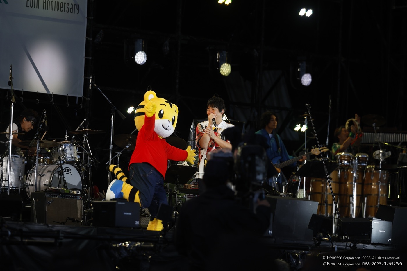 スペシャルゲストのしまじろうと披露したのは、毎週土曜日に放送中のテレビ番組『しまじろうのわお!』のために書き下ろした楽曲「コトバリズム」。会場のちびっ子も大いに盛り上がった。