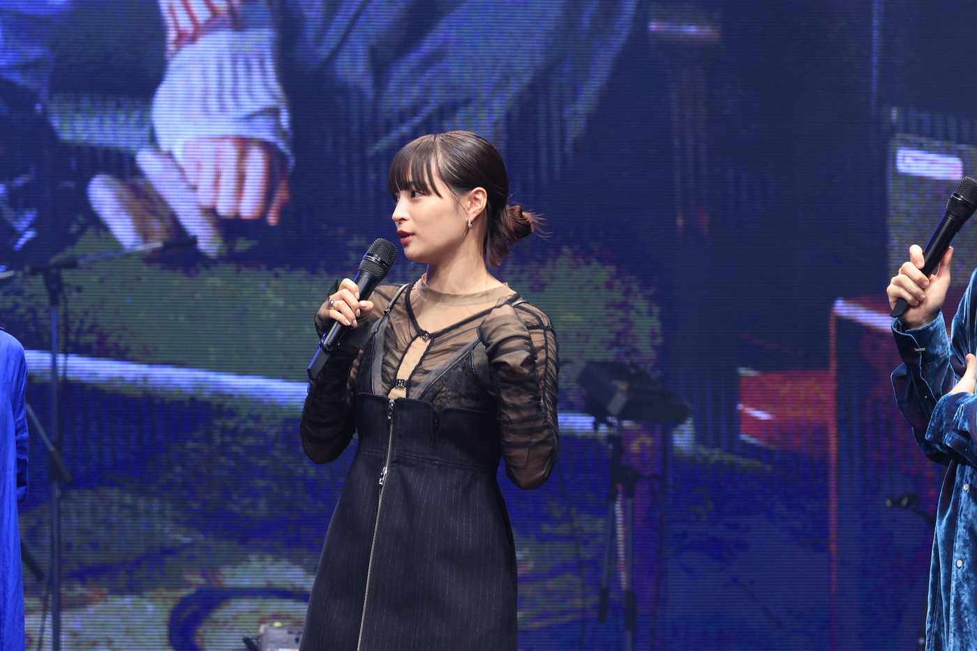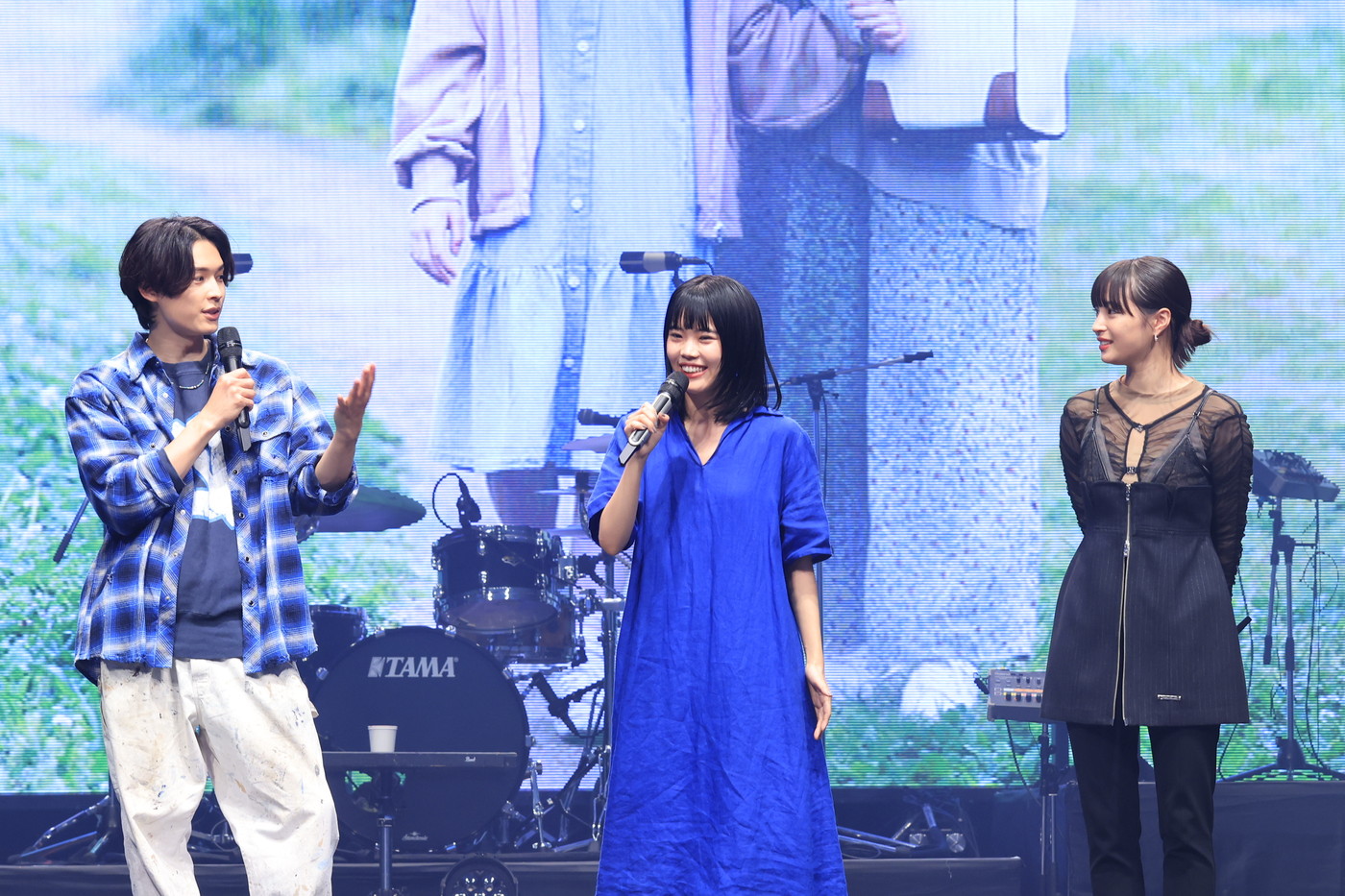 アイナは「3人でライブするのは実質、今日が初めてです。多分最初で最後になるんじゃないですかね」と、劇中以外では初の貴重なライブであることを明かし、また、「松村さんは人生初めてのギターを練習されたみたいで」と本作で松村がギター初挑戦になったことについて言及。松村は「弾く前にその話すると、めちゃくちゃ緊張しちゃうので、弾き終わったあとどこかで話します…」と初ステージを前に緊張を隠せない様子だった。