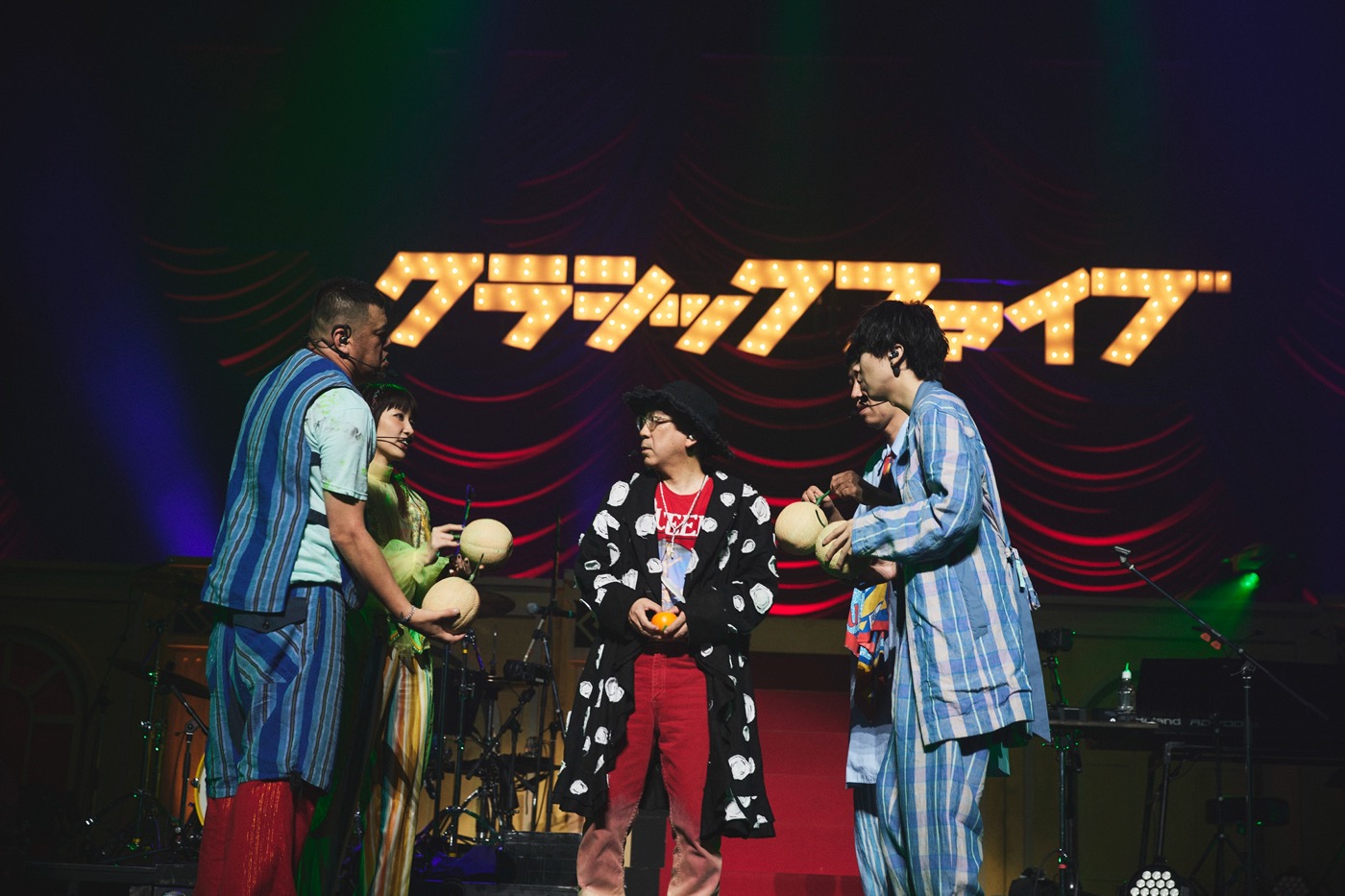 ドラム・小籔千豊、ベース・くっきー!(野性爆弾)、ギター&プロデュース・川谷絵音、キーボード・新垣隆、ボーカル・中嶋イッキュウ(tricot)という豪華メンバーからなる5人組バンド、ジェニーハイが、全国10ヵ所を巡ったホールツアー『ジェニーハイ TOUR2023 クラシックファイブ』のファイナル公演を、9月26日、東京国際フォーラム ホールAにて開催した。