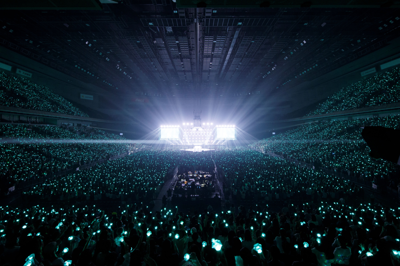 そこへKEY、MINHO、TAEMINが登場。UFO型のセットに乗り、天井付近から現れたメンバーに歓喜する観客。TAEMINが「東京! 久しぶりだな」と叫び、1曲目「Chemistry」が始まる。ペンライトの光が波打つ客席を見据えるメンバーの凛とした表情が、メインステージの左右に据えられた巨大モニターに映し出される。