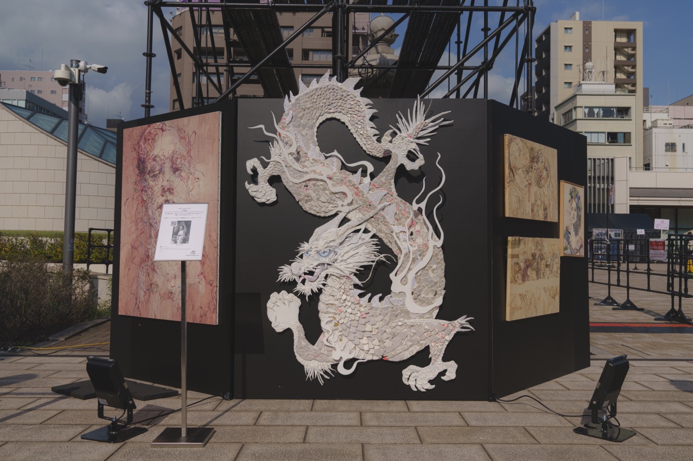 そんな中、入場ゲートを進むと、これこそ“圧巻”という言葉が相応しいとも言える2機の盆栽が来場客を迎え入れてくれた。 隣には、古着が木目込まれた平面かつ立面的で緻密に計算された、まるで錯覚を呼び起こすようなトリックかつサスティナブルなアートが聳え立つ。進むと、繊維で施された更なる繊細なアートが見るものを魅了し、そんな驚きも束の間、通路反対を見ると、約5.4mの巨大な障子にtattoデザインが施された和紙のアートが強固たる存在感を解き放っていた。