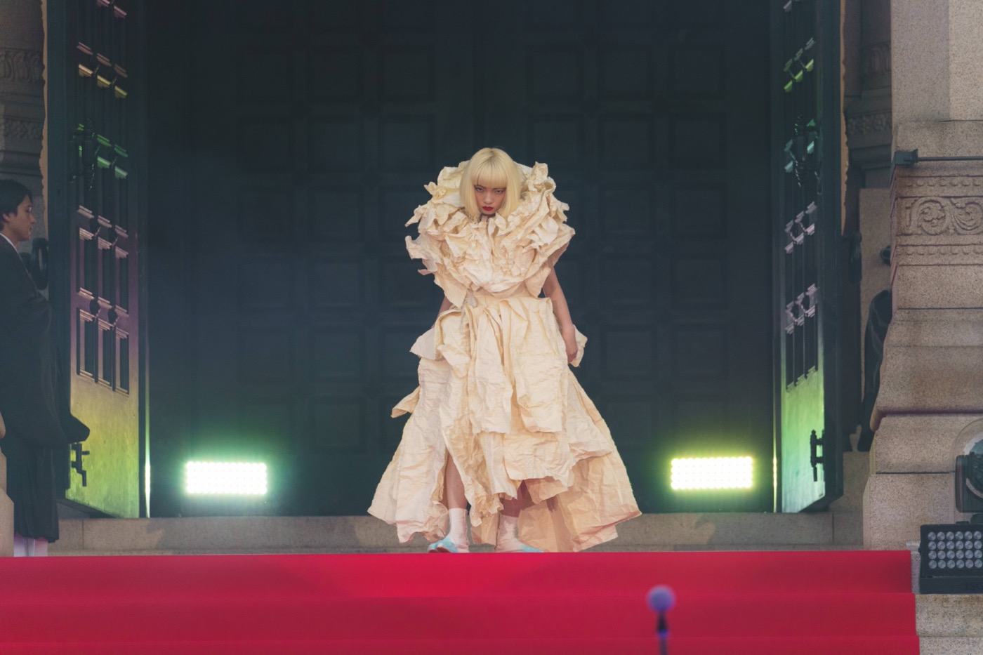 続く3組目のアーティストのステージが始まる前に、アートクリエイションとしてアパレルブランド「ACUOD」2024ssシリーズのランウェイステージが展開される。築地本願寺という空間の中で行われるランウェイショーは特別なステージとなり、ブランドの世界観含め類稀なるステージとなった。