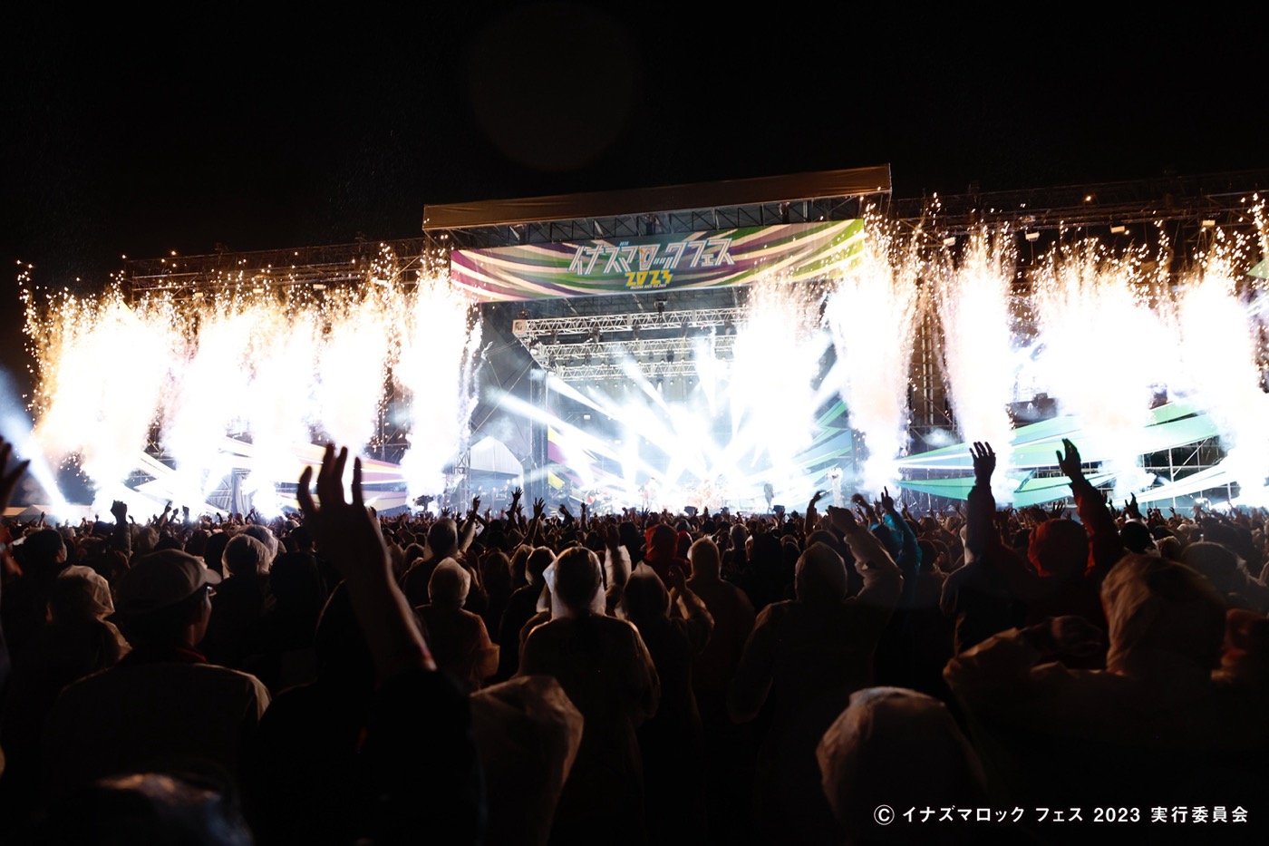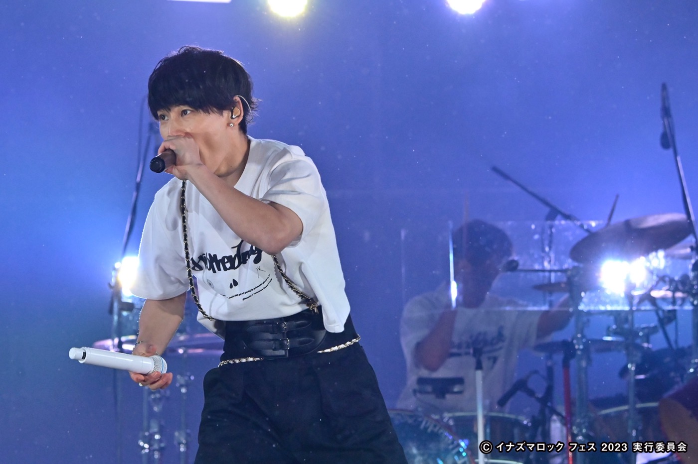 2023年で6回目の出演となるのは、名古屋発4人組ロックバンド04 Limited Sazabys。フリーエリアの風神ステージへの出演に始まり、メインの雷神ステージに出演するバンドにまでに成長した。「一緒に行けるか! 04 Limited Sazabysはじめます!」と、TVアニメ『弱虫ペダル LIMIT BREAK』OPテーマ「Keep going」でスタート、「My HERO」「Galapagos II」へと続く。「今年のイナズマも、ごった煮なアーティストの中で出られてうれしいです。今年もここに立てることを誇りに思います。僕らは2014年に風神ステージから始まって、この雷神ステージへ辿り着きました。僕らがどうやって勝ち上がってきたのか、叩き上げのバンドだっていうのを、観てもらいたい」と、フォーリミの代表曲とも言える「monolith」をプレイ。彼らは2016年から地元・愛知で自分たち主催のフェス『YON FES』を開催しているが、これもイナズマに出演して西川のアクティブな向上心に刺激を受けて始めたことだという。雨足が強まるなか、「Finder」「Alien」「Terminal」「Just」と全8曲、パワフルなサウンドにハイトーンボイスで客席を魅了した。