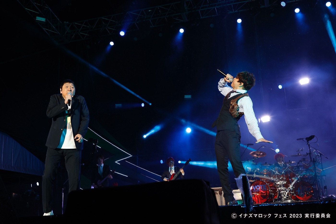 2日目のトリは、雨の中T.M.Revolutionがつとめた。西川は、選挙カー風のバンの上に乗って客席前方から登場、真っ赤な拡声器型マイクで「Out Of Orbit〜Triple ZERO〜」を歌う。車をステージに横付けして、そのままステージ上へ。ボルテージの高まった観客は、ファイヤーボールがあがるなかでプレイされる「魔弾〜Der Freishutz〜」でさらに興奮のるつぼと化す。西川も「最高やないか、イナズマ!」と叫び、続く「THUNDERBIRD」を繊細に、そしてパワフルに歌い上げる。「台風にはなりませんでしたが、みんなの汗と涙が雨雲になりました。15年前 12組のアーティストで始まったイベントが、今では150組が集まるイベントになった」と話して「LEVEL4」へ。続く「HIGH PRESSURE」では、スペシャルゲストとして明石さんまのモノマネで知られる芸人・ほいけんたが登場。ふたりで歌うのは…当然「HIGH PRESSURE」ならぬ「ホイ プレッシャー」。ほいが独特の裏声を駆使して“カラダぐぅ”と歌うと西川もそれに乗っかり、ふたりでステージを自由に楽しんでいた。2009年の第1回イナズマロック フェスで最終日のサプライズゲストに明石家さんまが出演して「HIGH PRESSURE」を歌ったこともあり、15周年となる今回、さんまのモノマネをしたほいと、そのときと同じ曲を歌うことに、西川も感慨深げだった。