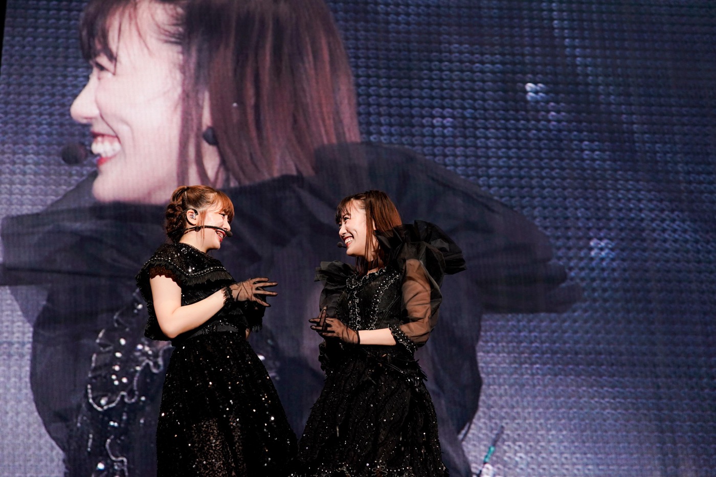 そして、ここからが後半戦というこのタイミングで、いつもの自己紹介を展開。声出し解禁後、自己紹介はやはり、ももクロとモノノフの絆を感じられる場面のひとつだと再認識させられる。ABEMAの生配信を観ているファンに向けて呼びかけたり、Tシャツやタオルなど今回のファイナル限定のグッズ紹介をしたりしながら繰り広げられるワチャワチャとした4人のフリートークで会場がほっこりとしたところで、「HAND」と「リバイバル」の2曲を披露。「リバイバル」は、アカペラから始まるこのツアーオリジナルのアレンジとなっており、4人の歌唱力やラップ、そして、4人の声が重なるハーモニーの魅力を大いに感じられるブロックとなった。