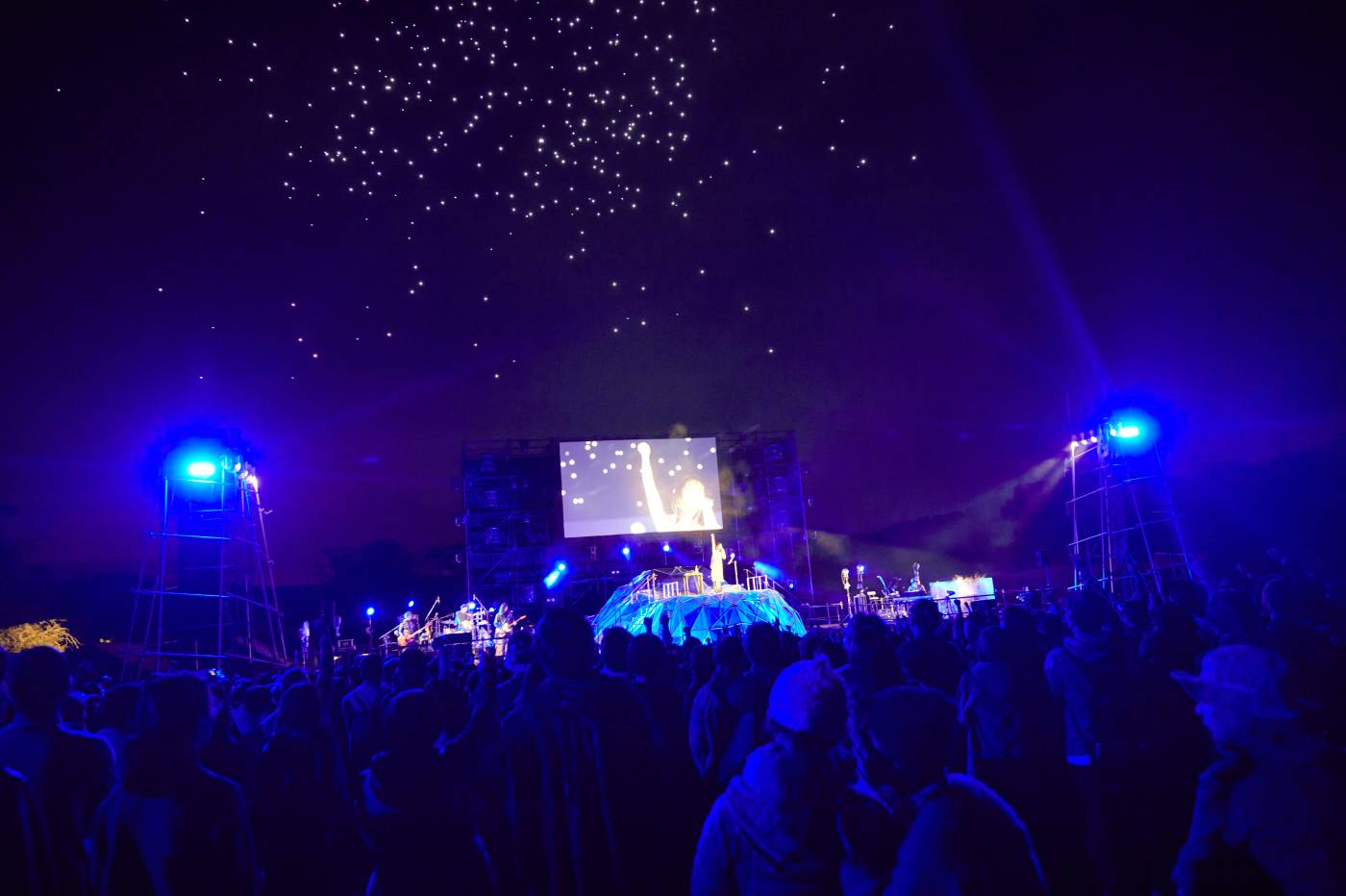 Kyrieが手を振り上げると、真っ暗な夜空に無数のドローンが光り輝き、満点の星空の演出のもと、歌い続けた。