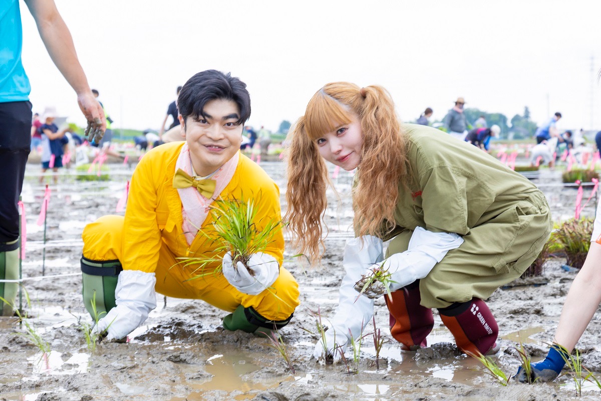 最後は、加藤と益若が田植えをし、アキラ100%とはなわが稲刈りをした行田の田んぼアートの稲を花束風にまとめた“稲束”がGACKT、二階堂に贈呈されフォトセッションを実施。