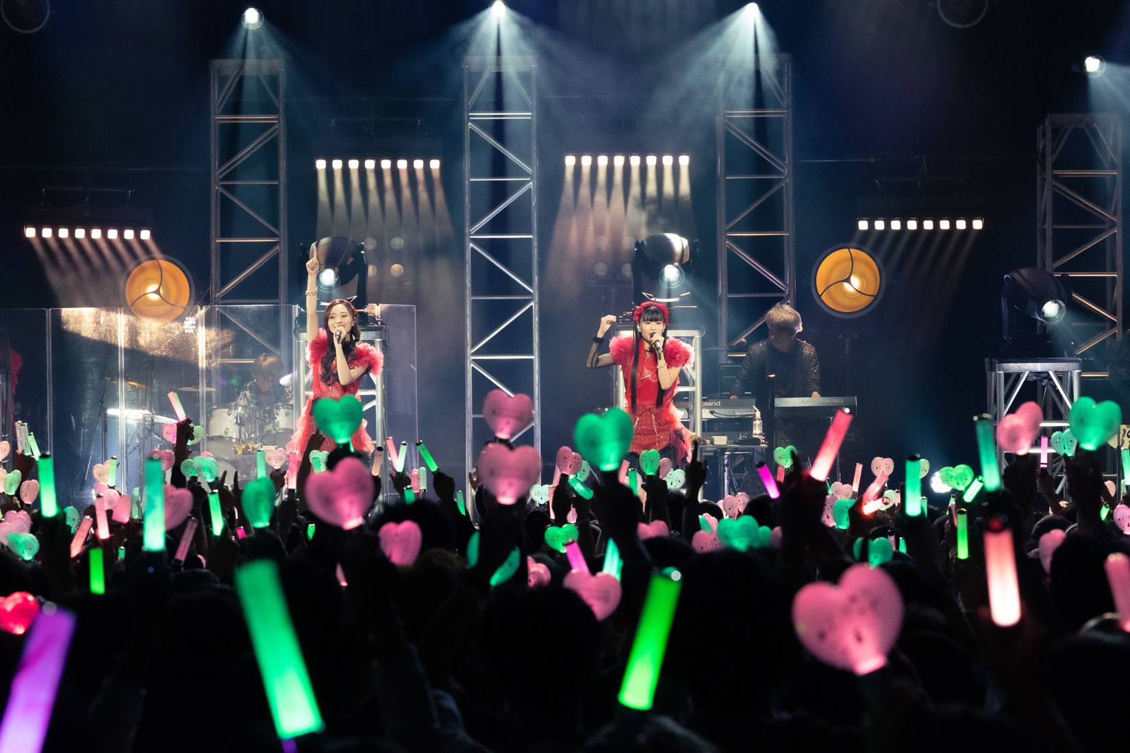 ライブは、曲名がすでにタイトルを内包している「ナイショの話」で幕を開けた。ryo(supercell)が書き下ろしたアニメ『偽物語』のEDテーマで、兄に対する妹のヤキモチを歌ったロックンロールナンバー。歌詞がすでに“口には出せないもやもや”を歌っているのだが、この曲にはもうひとつ、秘められたものがあった。冒頭で、クララとカレンのふたりはステージ袖から「ワン、ツー、ワンツースリーフォー!」と元気よくカウントをとっていたが、実はこのフレーズはリリースされたばかりの27枚目のシングル「ふぉりら」にサンプリングされている。2012年リリースの4thシングルを1曲目に持ってきたのは彼女たちの遊び心の現れだろう。