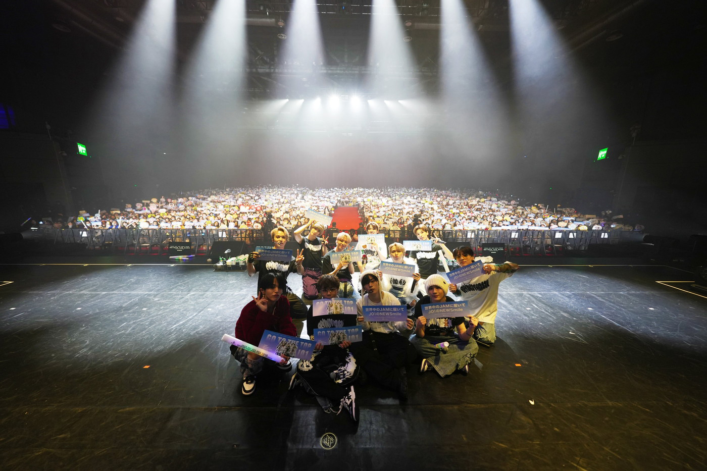 最後に全員で写真撮影を行おうとすると、会場に集まったJAMから「世界中のJAMに届いてJO1のNEWSmile」と書かれたスローガンが掲げられ、メンバーもとてもうれしそうな様子だった。