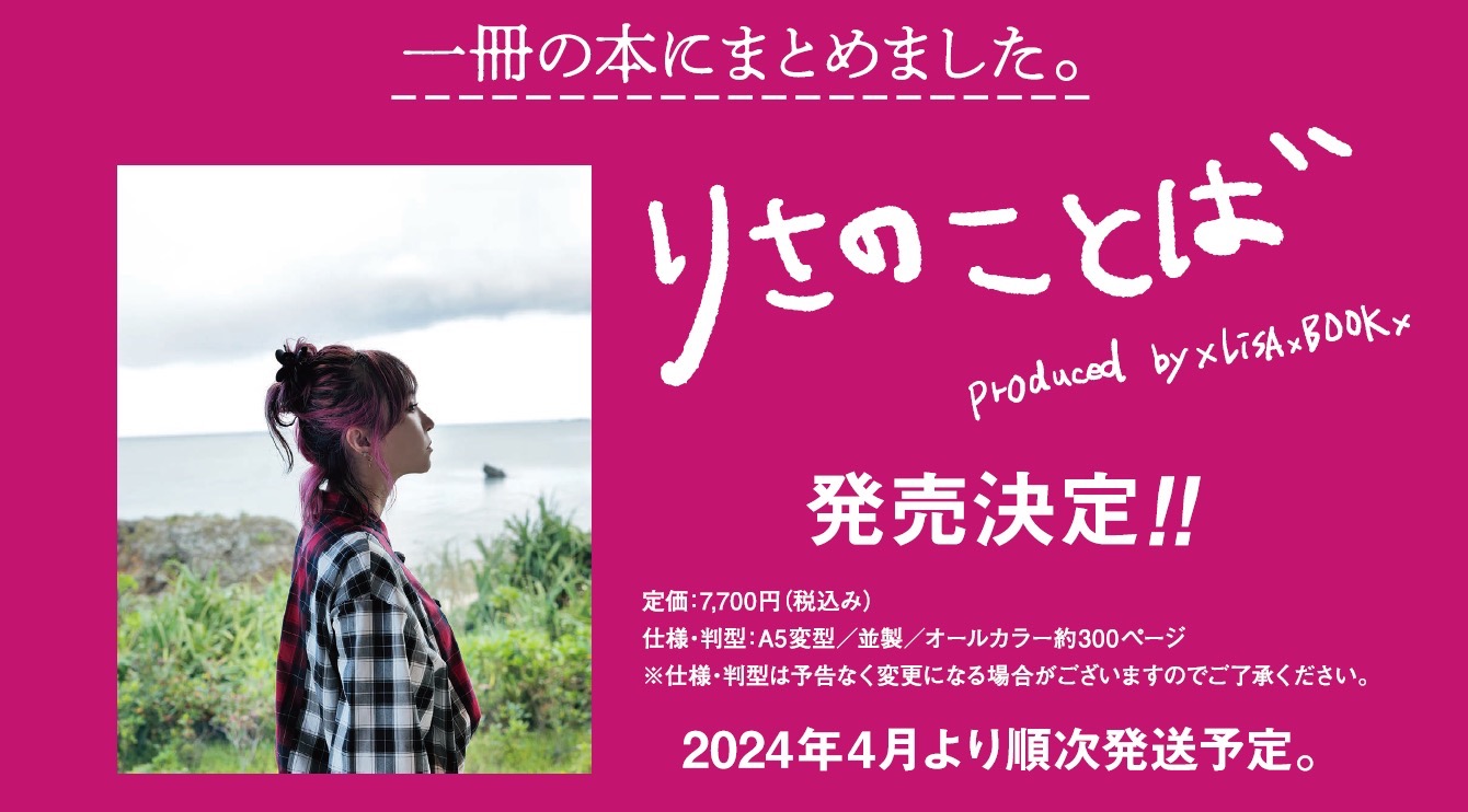 また同日には、10年以上にわたりLiSAが発した言葉を一冊の本にまとめた『りさのことば』(Produced by xLiSAxBOOKx)の発売、12月17日に東京ガーデンシアターで開催された『LiVE is Smile Always〜LANDER〜』ツアーファイナル公演の模様が、CS放送TBSチャンネル1で2024年2月に放送決定の情報もあわせて解禁となった。