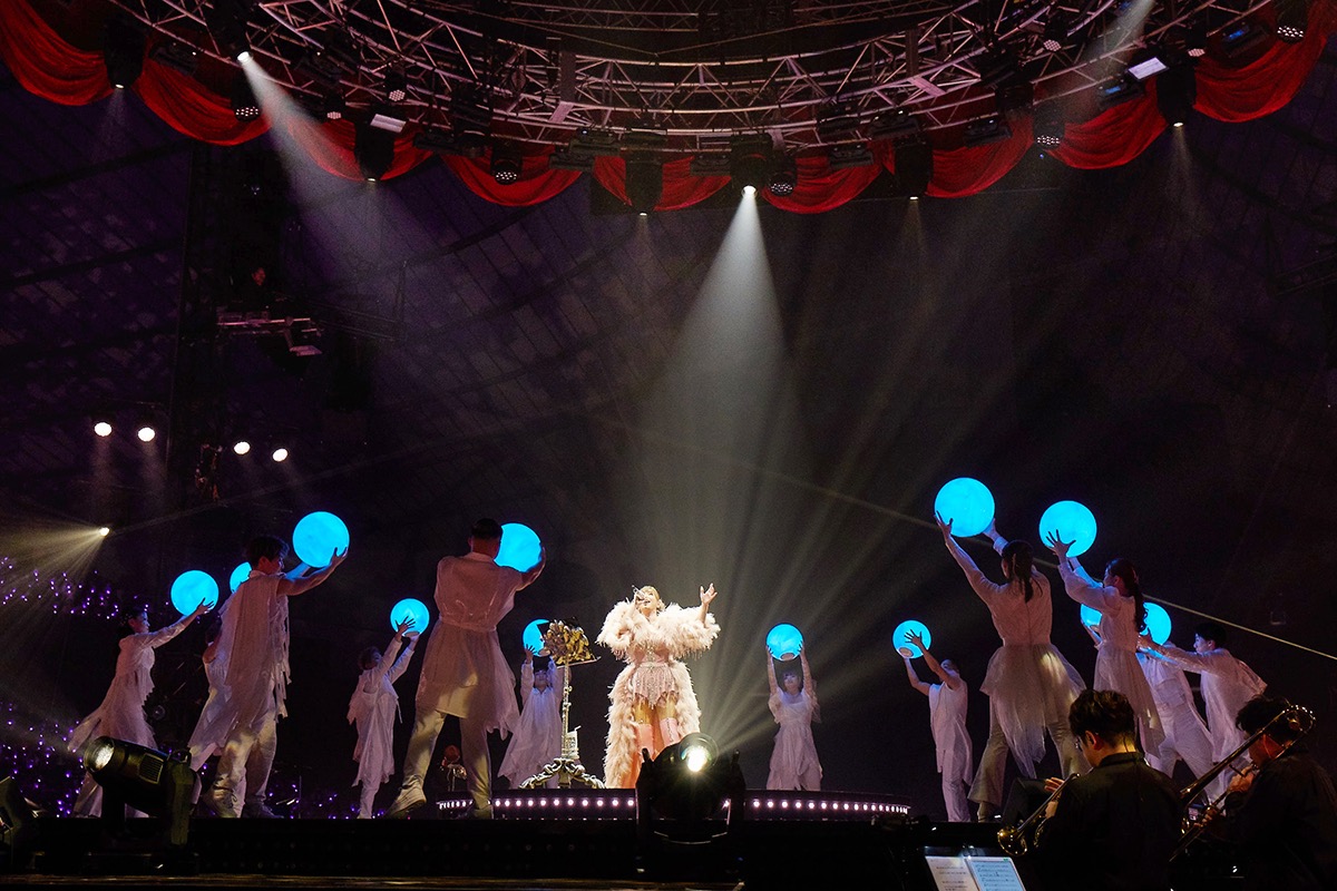 アリーナ中央に組まれたセンターステージには、浜崎をはじめ、ダンサー、パフォーマー、バンド、ストリングス、コーラス、クワイヤー、獅子舞パフォーマー、総勢35名ものサポートメンバーが登場し、記念すべきアニバーサリーイヤーの年越しに花を添えた。