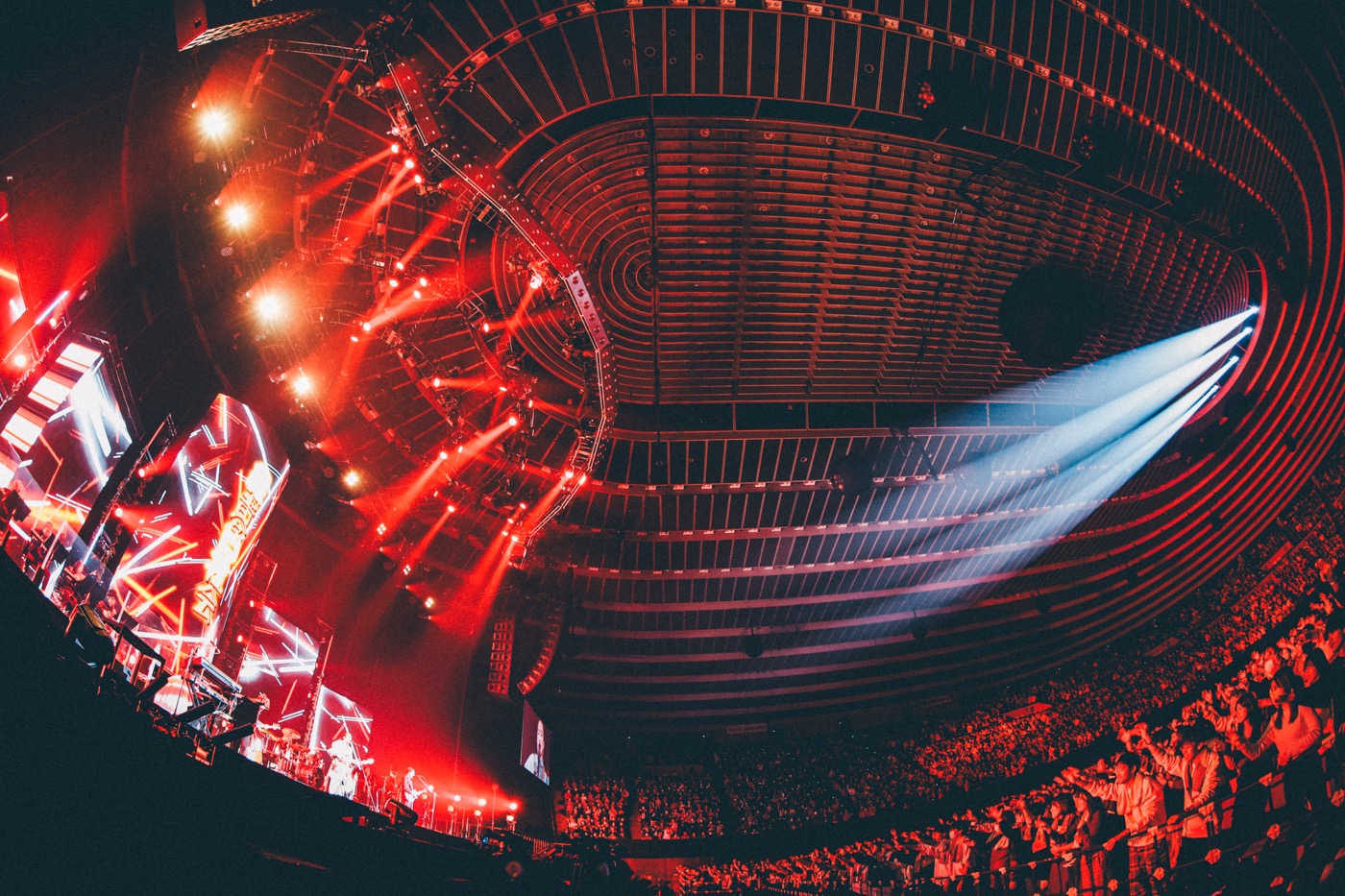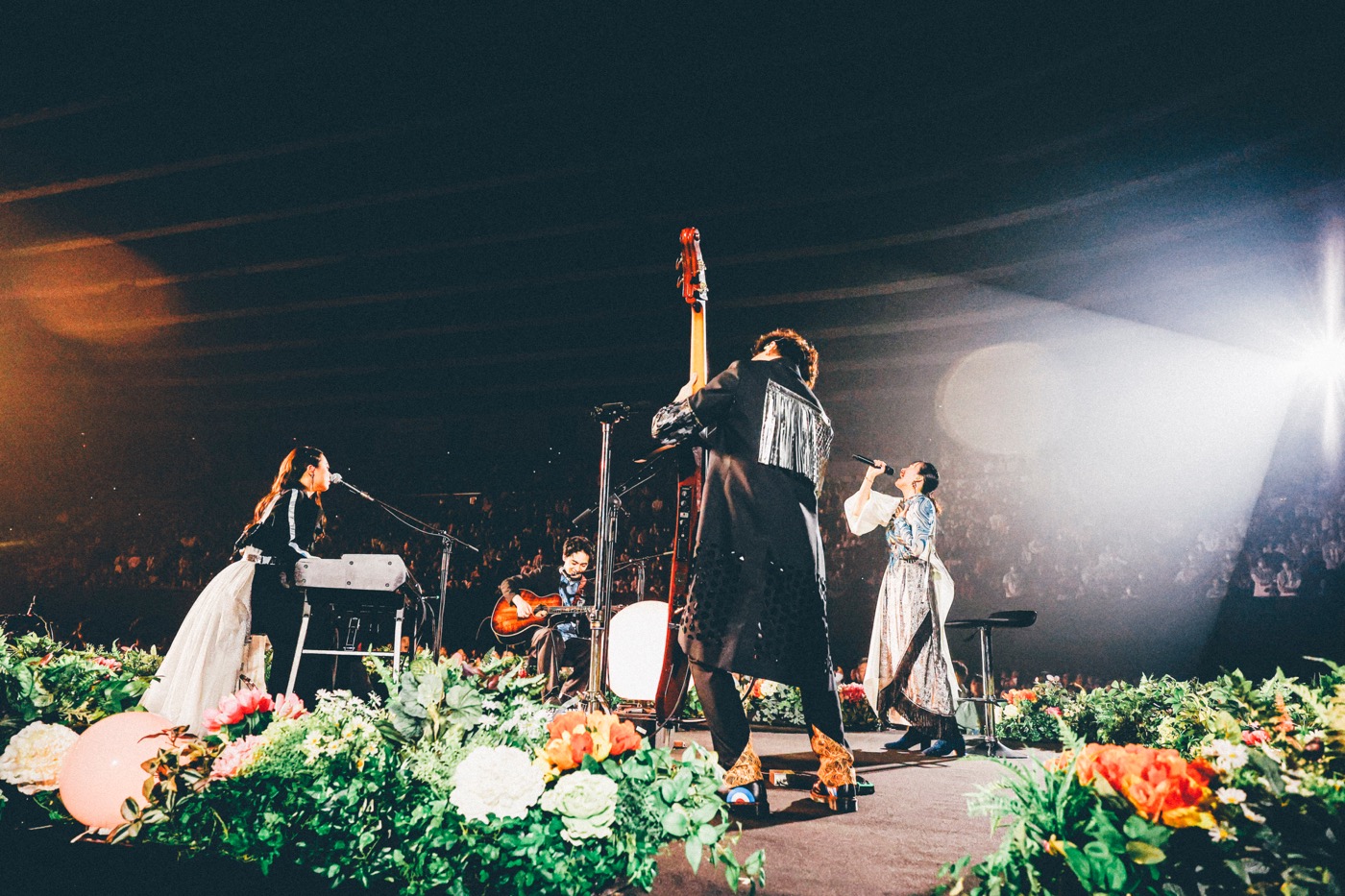 「あのころ見た光」「陽はまた昇るから」で観客の高揚感をなおも増したあと、「もっと近くで、みんなの顔を焼き付けに行きますよ!」(長屋)とメンバー4人が舞台を降りて、アリーナ後方のサブステージまで客席を横切る形で移動。4人が向かい合い、アコースティックセットで演奏した「Re」「時のいたずら」は、1万人で言葉とメロディを囲むキャンプファイヤーのような没入感を描き出していた。