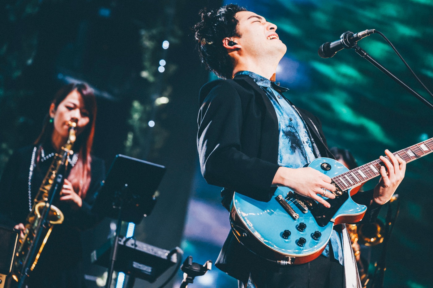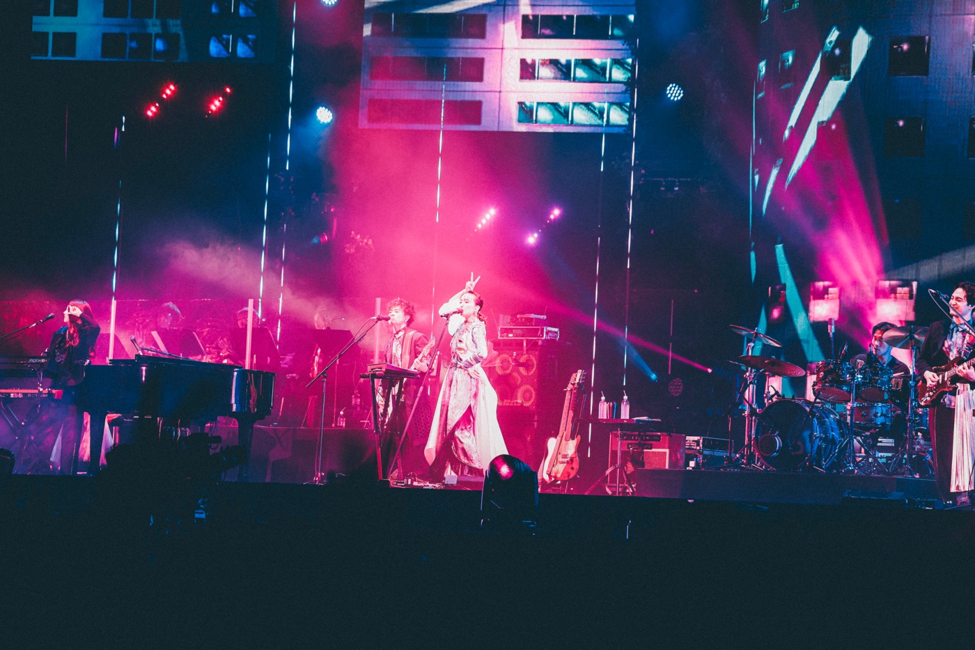 満場の拍手喝采を受けて、長屋晴子(Vo&Gu)、小林壱誓(Gu)、peppe(Kry)、穴見真吾(Ba)とサポートドラマー・比田井修が舞台に登場すると、「これからのこと、それからのこと」のアグレッシブな熱演でライブはスタート。続く「アウトサイダー」ではストリングスカルテットを迎えて豊潤なサウンドを響かせると、さらに「始まりの歌」ではブラストリオが演奏に参加、総勢12名のダイナミックなアンサンブルが会場一面のクラップを巻き起こしてみせる。その後も、楽曲によって弦楽やブラスの音色を加えながら、楽曲が持つ鮮やかな色合いとコントラストをよりいっそう明確に浮かび上がらせていた。