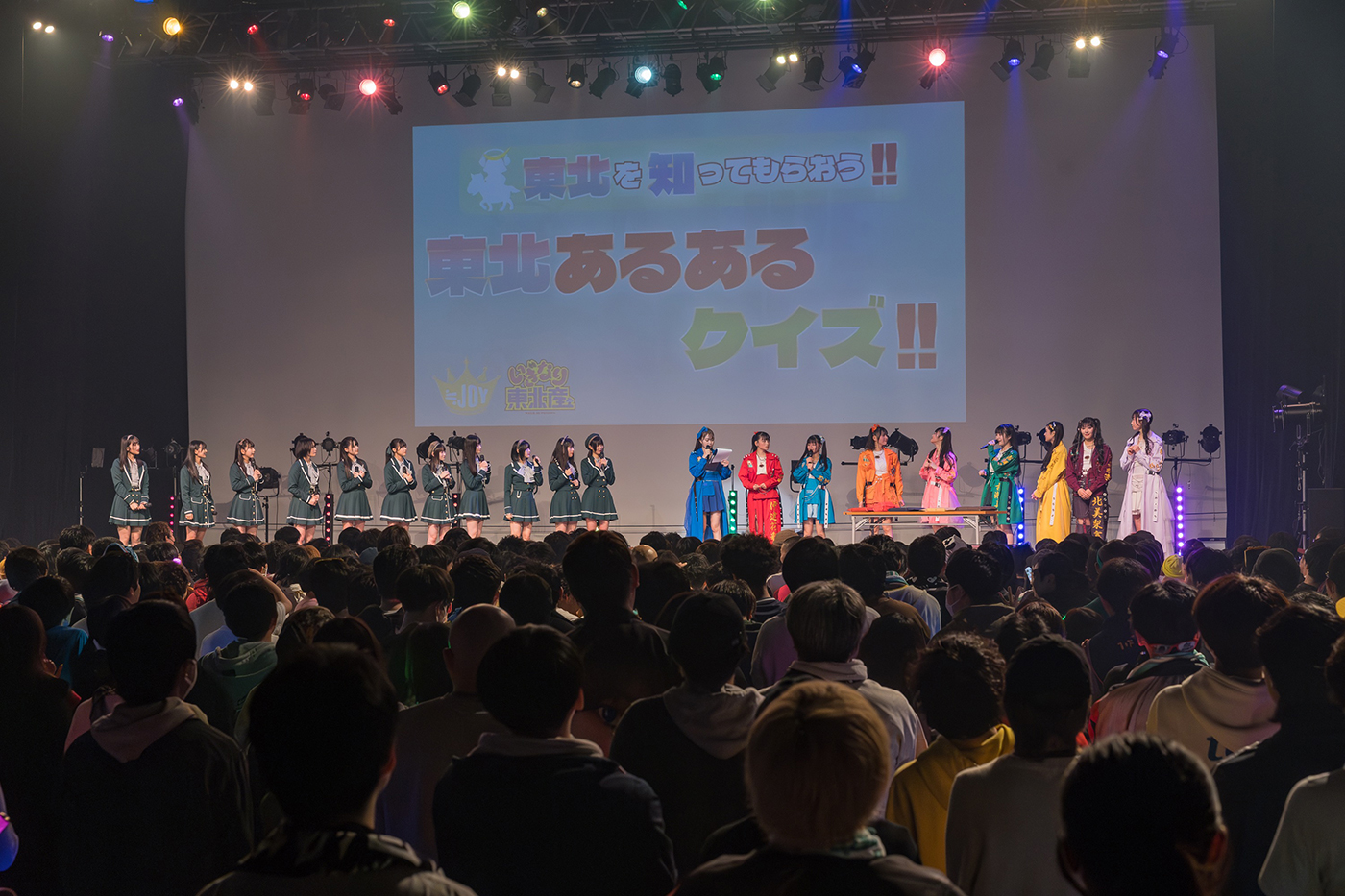 またイベント後半では、サッカーの試合終了後にユニフォームを交換するように、お互いのグッズ交換により親睦を深めた両者。いぎなり東北産が用意した「東北あるあるクイズ!!」に≒JOYメンバーが答えるなど企画色の強いトークパートでもファンを喜ばせた。