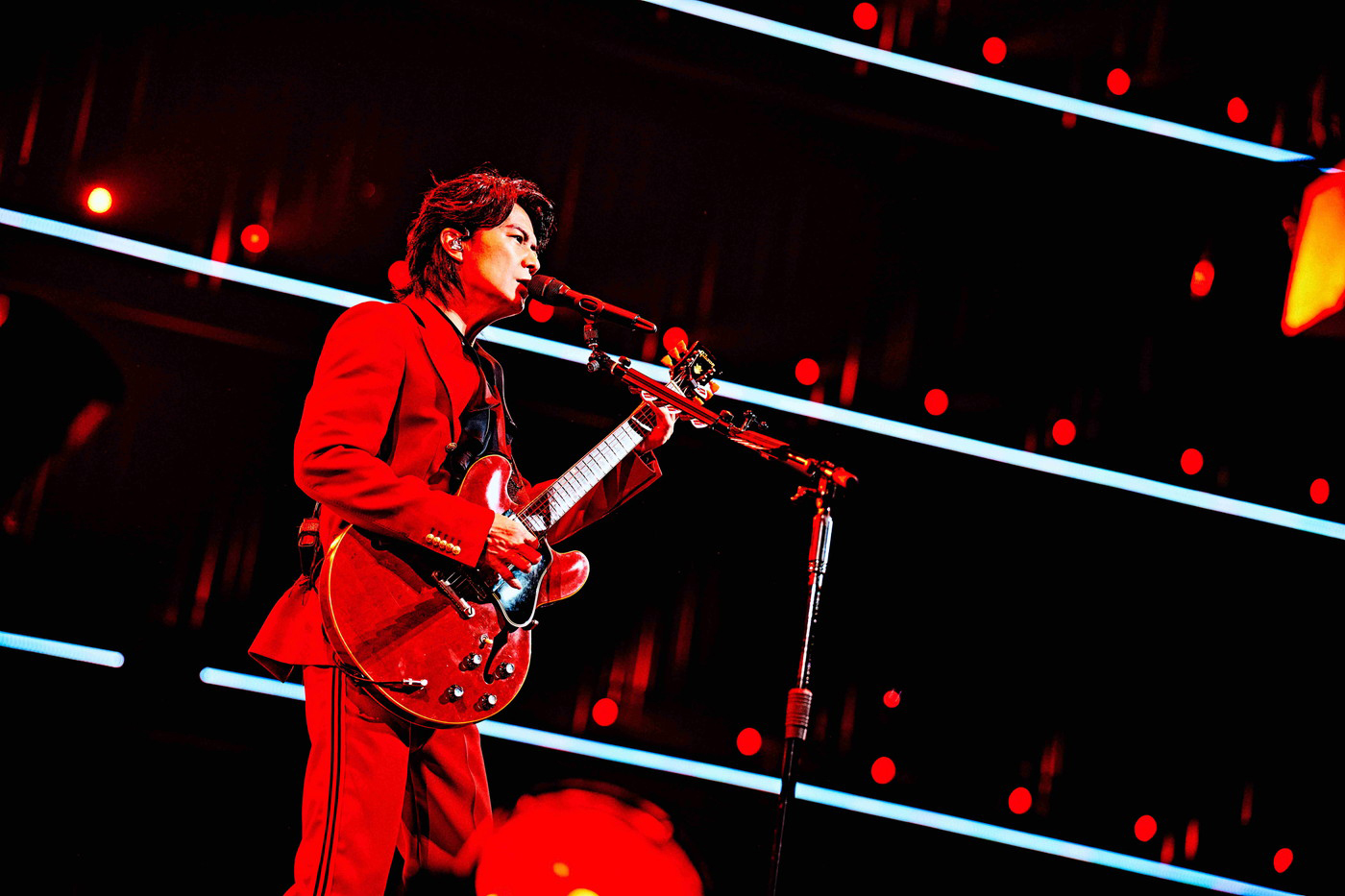 ラストで特効が爆ぜ、煙が立つステージで始まった「妖」では、雄弁なハンドモーションを交えながらミステリアスにパフォーマンス。とりわけ顔の半分を掌で覆う仕草からは、虚実を行き来する人間の心模様を深読みしてしまう。