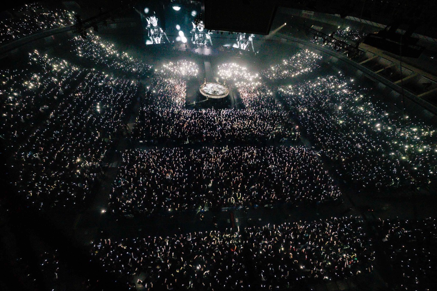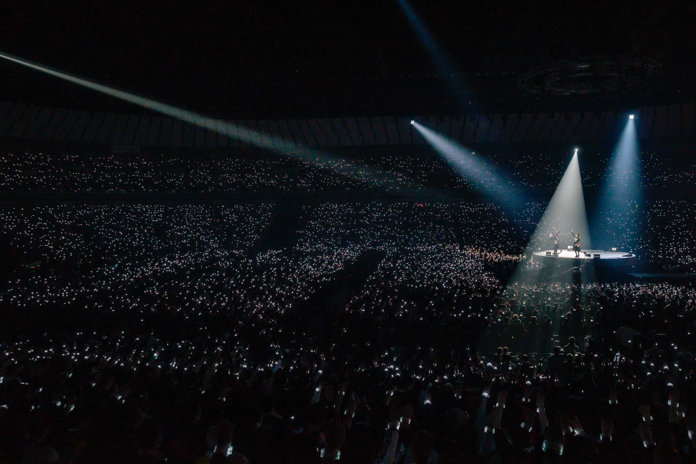 「シンコペーション」のパフォーマンスに会場が沸くと、舞台はセンターステージへと移り、オーディエンスのコーラスのシンガロングとともに「Monochrome」では、来場者全員に配布された「神器」のライトの美しい光の世界が広がった。昨年の夏以降、フェスやワールドツアーですっかりお馴染みとなった三味線の音が流れてくると、神バンドのソロが続き、BABYMETALは花道を戻りメインステージへ。「メタリ!! (feat. Tom Morello)」の威勢の良い「どっこいしょ!」や「わっしょい!」の掛け声とともに誰もがお祭り騒ぎのカオスに飲み込まれ、SU-METALの「Everybody get low~」のMCで、オーディエンスがしゃがむとMOMOMETALのトラディショナルJ-RAPパートの後の「Are you ready?」のデスボイスで会場が爆発的な盛り上がりを見せ、ライブは終盤に入った。
