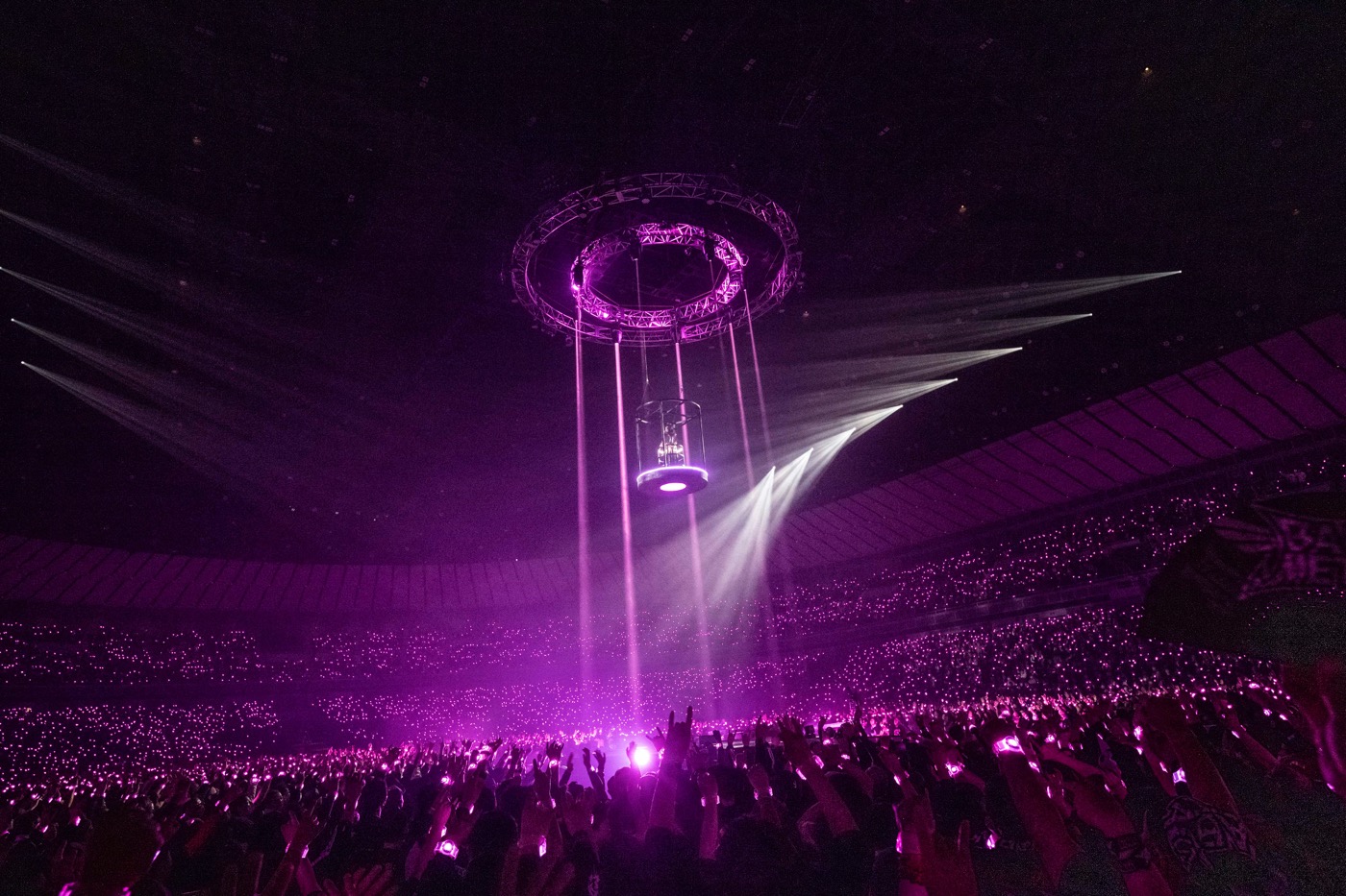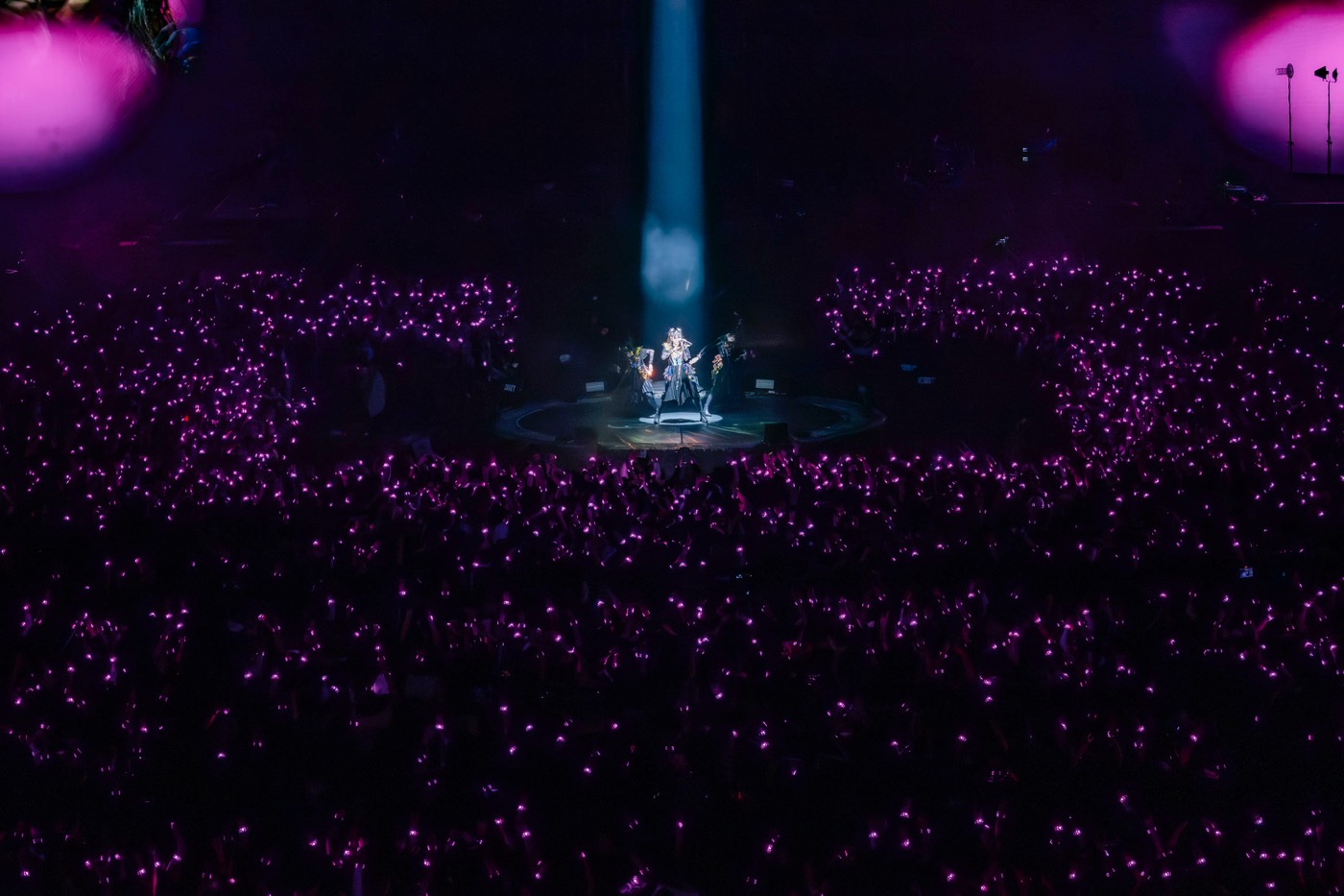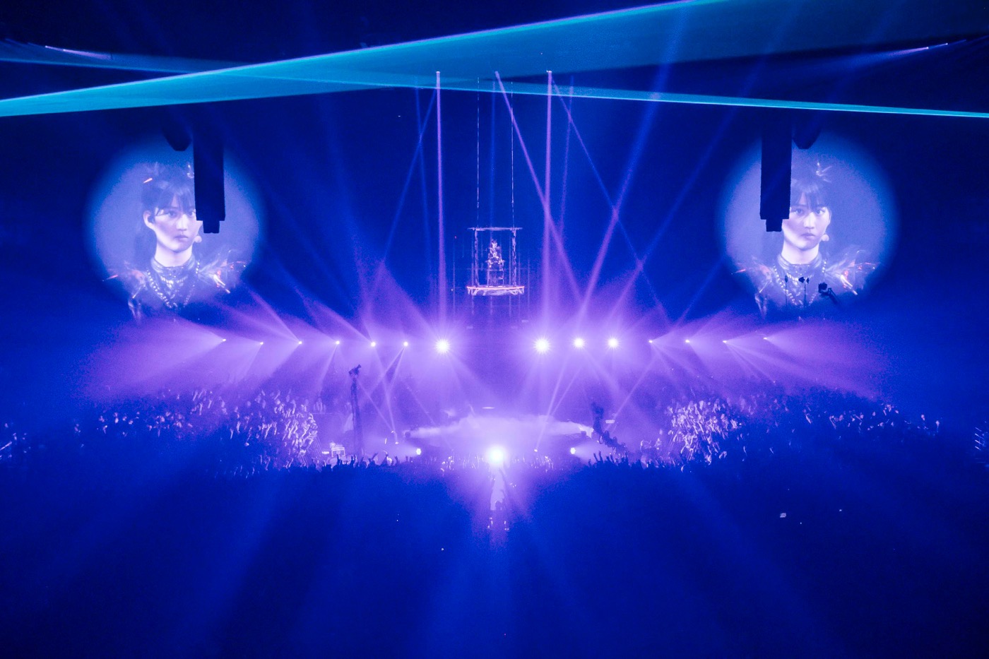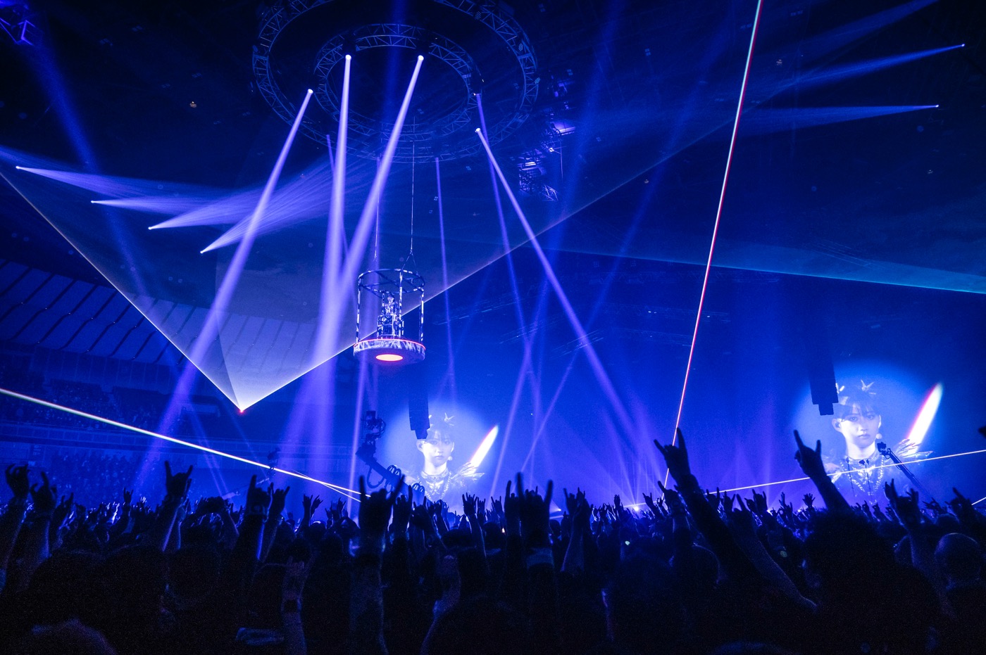 2024年リリースから10周年を迎えた1stアルバム『BABYMETAL』より「ギミチョコ!!」と「ド・キ・ド・キ☆モーニング」で原点回帰を果たすと、ファンのためのアンセムソング「THE ONE」が全てを包み込むかのように鳴り響き、会場がひとつになった。暗転し、しばらくすると、いよいよ、この日の主役であるMOMOMETALがパイプオルガンの音とともに天空からゴンドラでセンターステージに降臨し、20歳の聖誕の儀式が執り行われた。
