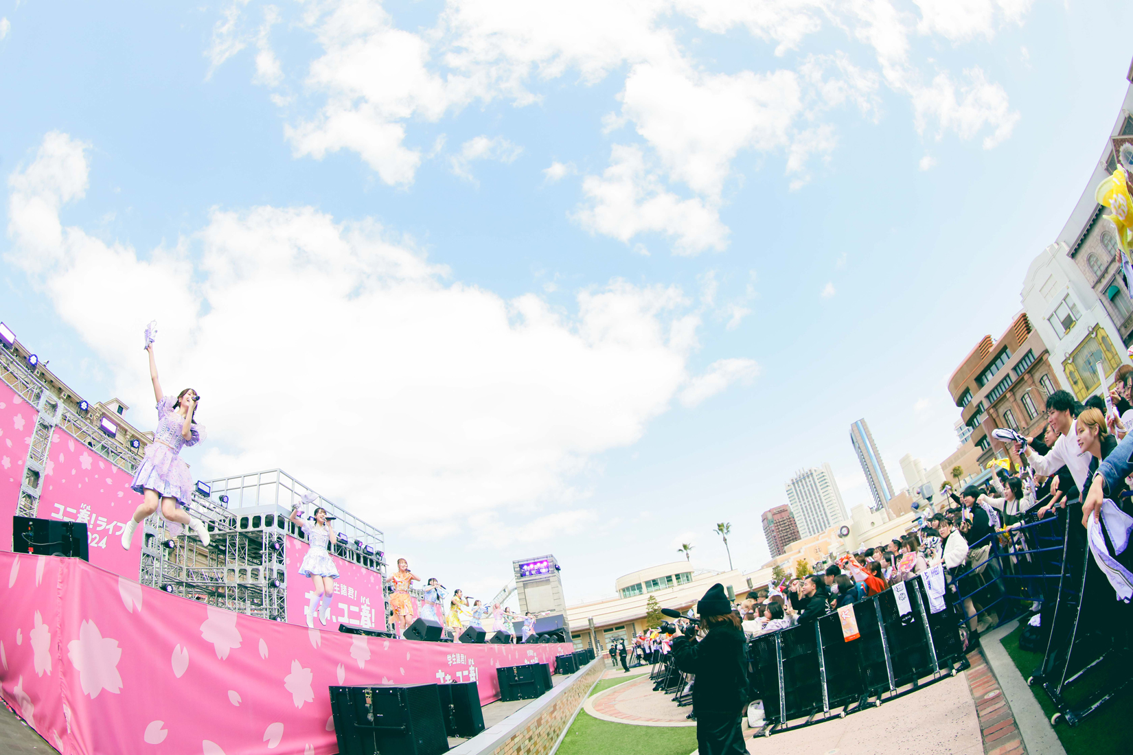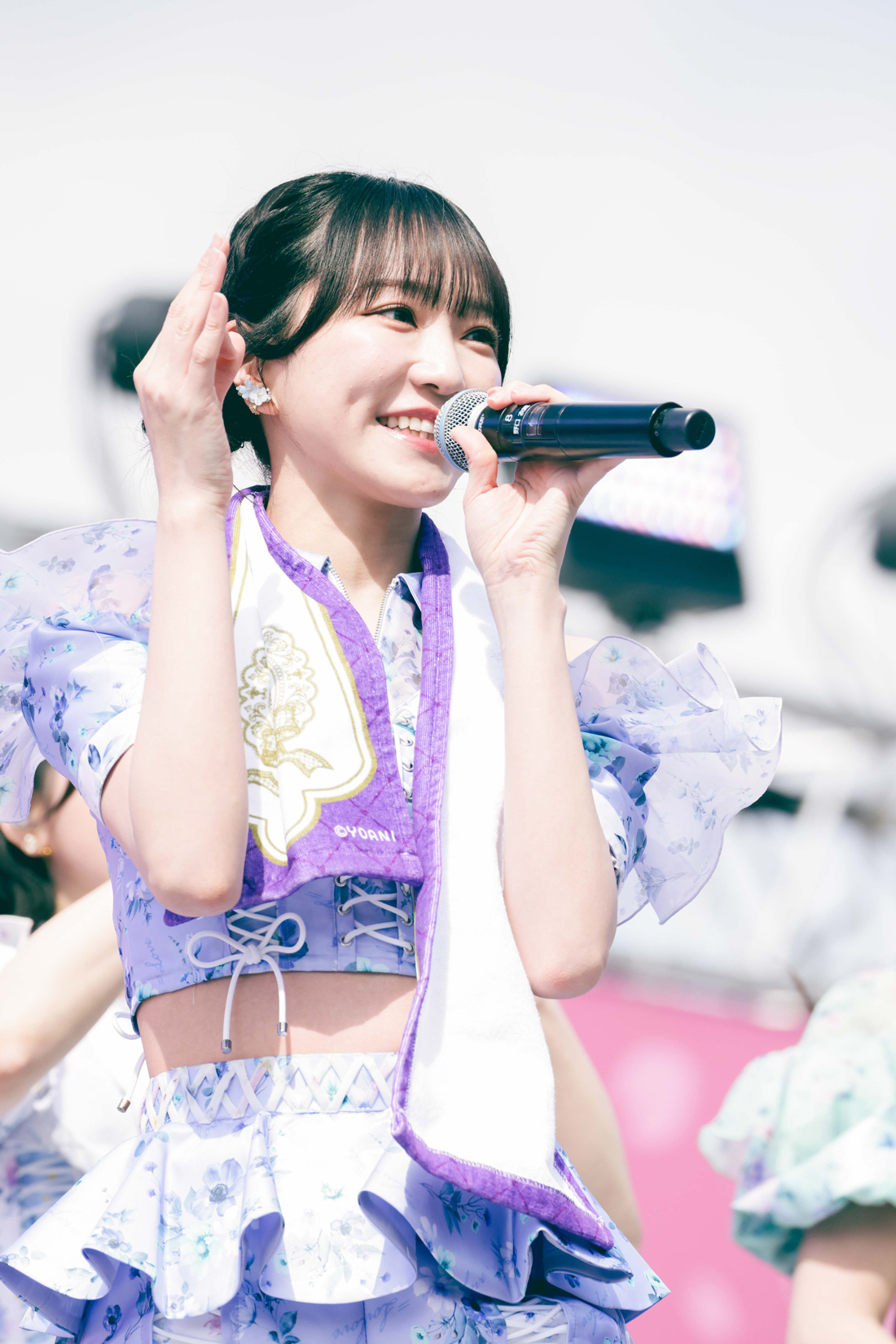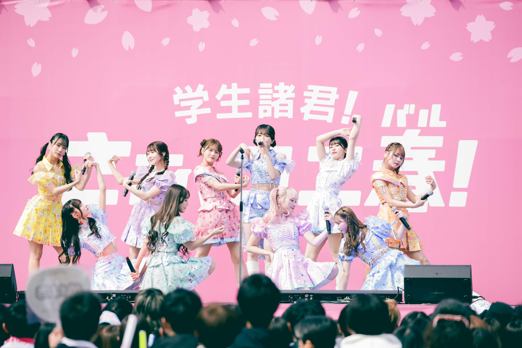 後半戦の幕開けを飾った「Oh!Darling」では、数え切れないタオルが宙を舞う絶景を生み出し、イコラブの自己紹介ソング「ヒロインズ」の、次々と移り変わるソロの見せ場も魅力いっぱい! それでも彼女たちの快進撃は止まらず、切なき名曲「「部活中に目が合うなって思ってたんだ」」、卒業ソングにして春のアンセム「探せ ダイヤモンドリリー」と畳み掛ける尊いの洪水。終始、全力の合いの手で応えるオーディエンスはとにかくパワフルで、佐々木舞香の歌声がユニバーサル・スタジオ・ジャパンの広大な青空を貫いた「この空がトリガー」、定番にして鉄板の「青春”サブリミナル”」とシングル曲を連発。そして、途切れることなく熱演が続いたライブも、いよいよフィナーレへ。
