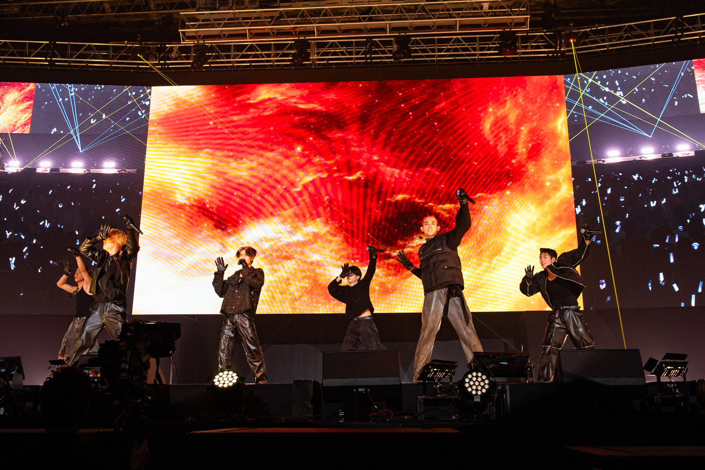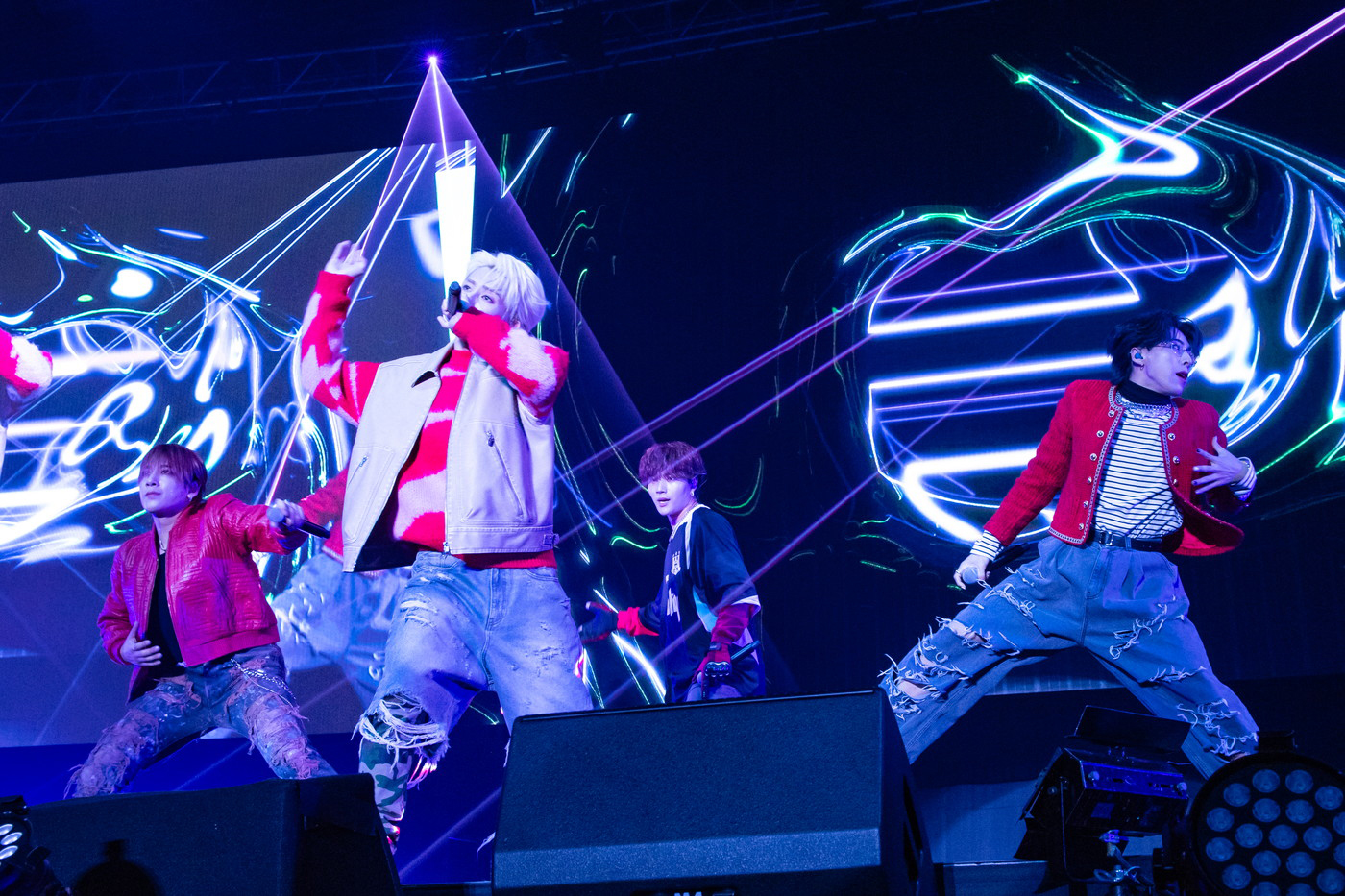 個性的な自己紹介で盛り上げたあと、スタイリッシュな「Don’t Let Me Down」、メロウでシティポップテイストの「Hey, girl」など音楽好きを唸らす選曲で魅了し、後半は彼らの真骨頂である攻撃的な「LRL-Left Right Left-」でガラッと空気を変え、銃を撃ち放つ振り付けが印象的な「Untouchable MAX」で最高潮に盛り上げ、最後は深々とお辞儀をし、次にバトンを繋いだ。