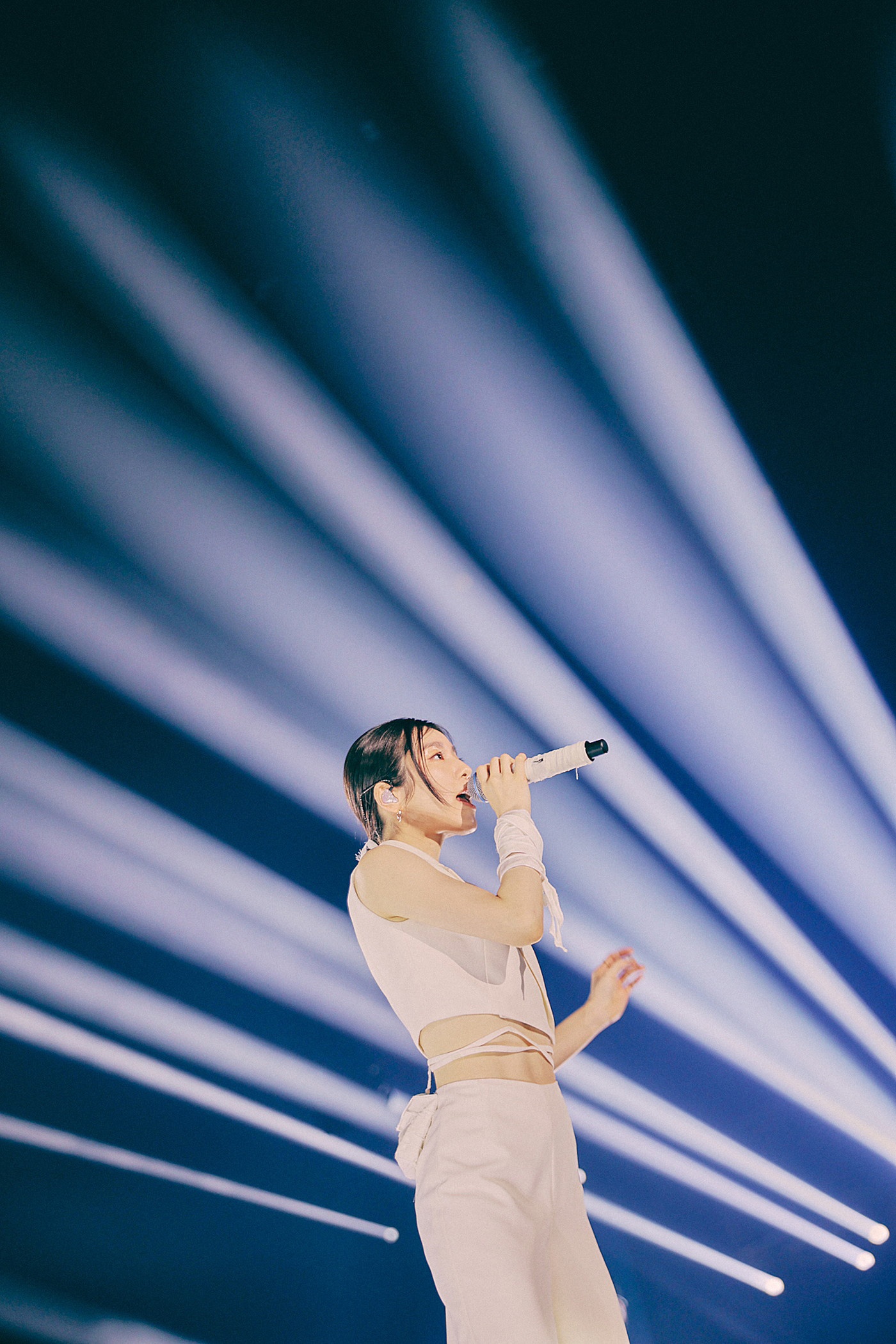 紗幕が振り落とされ後光差すなか登場したmiletは、白一色で構成されたパンツスタイルのクールな衣装で登場。余計なものを加え過ぎないことで内面の持つ強さを演出していた。