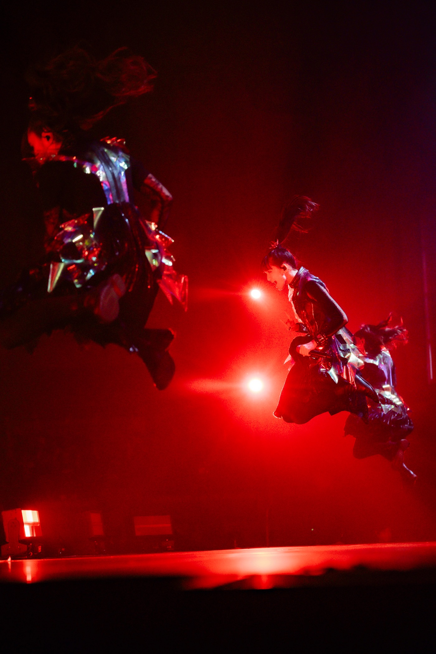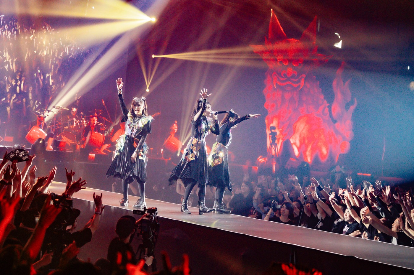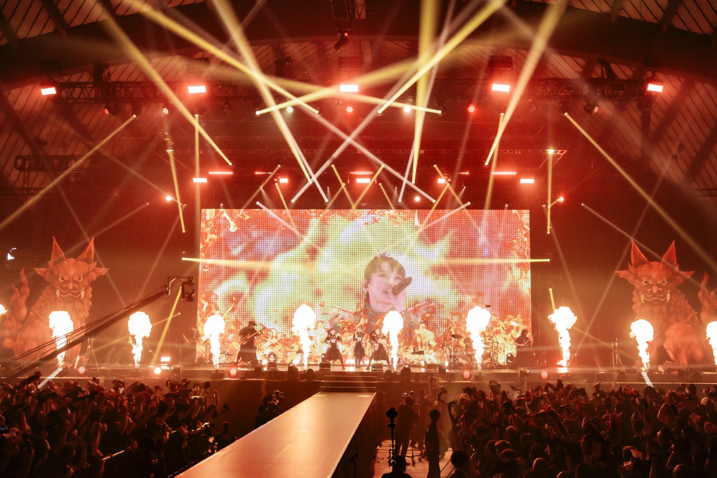 ストーリームービーで語られた、メタルの魂が神の化身に宿った“キツネ43”が象られた巨大な岩からBABYMETALが登場すると、「BABYMETAL DEATH」でライブが幕を上げた。ステージと客席の距離感が近いなかで、ステージ上のBABYMETALからは、強い気迫が波のように押し寄せ、会場は一気にライブモードに入った。続く「Distortion (feat. Alissa White-Gluz)」と「PA PA YA!! (feat. F.HERO)」では、炎の演出もあり、会場はさらに熱気を帯びた。「Shanti Shanti Shanti」では、SU-METALの歌の節回しも相まって、BABYMETALのしなやかで美しいダンスに引き込まれていった。
