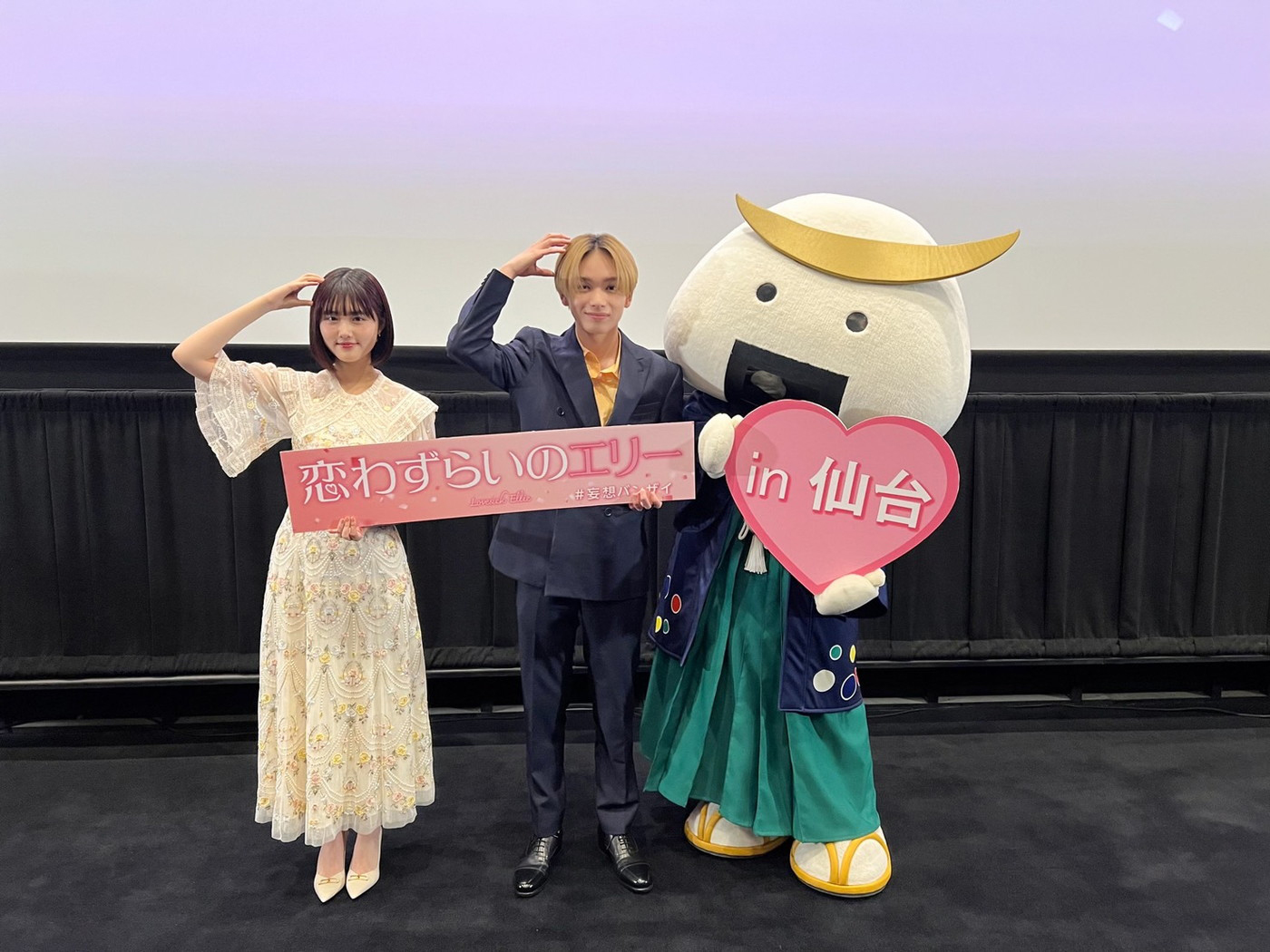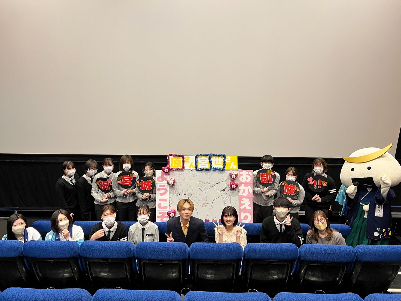 イベントには、仙台・宮城観光PRキャラクター「むずび丸」登場。映画を観て、話題になっている“ジャージキス”のシーンにキュンキュンしたと映画の感想をジェスチャーで伝えるむすび丸を相手に、宮世がジャージキスシーンを再現。宮世とむすび丸の見事な実演に「このシーンをそのまま映画にはめ込めばいいと思います!」と原も大絶賛、大盛り上がりのなか宮城での舞台挨拶は幕を閉じた。