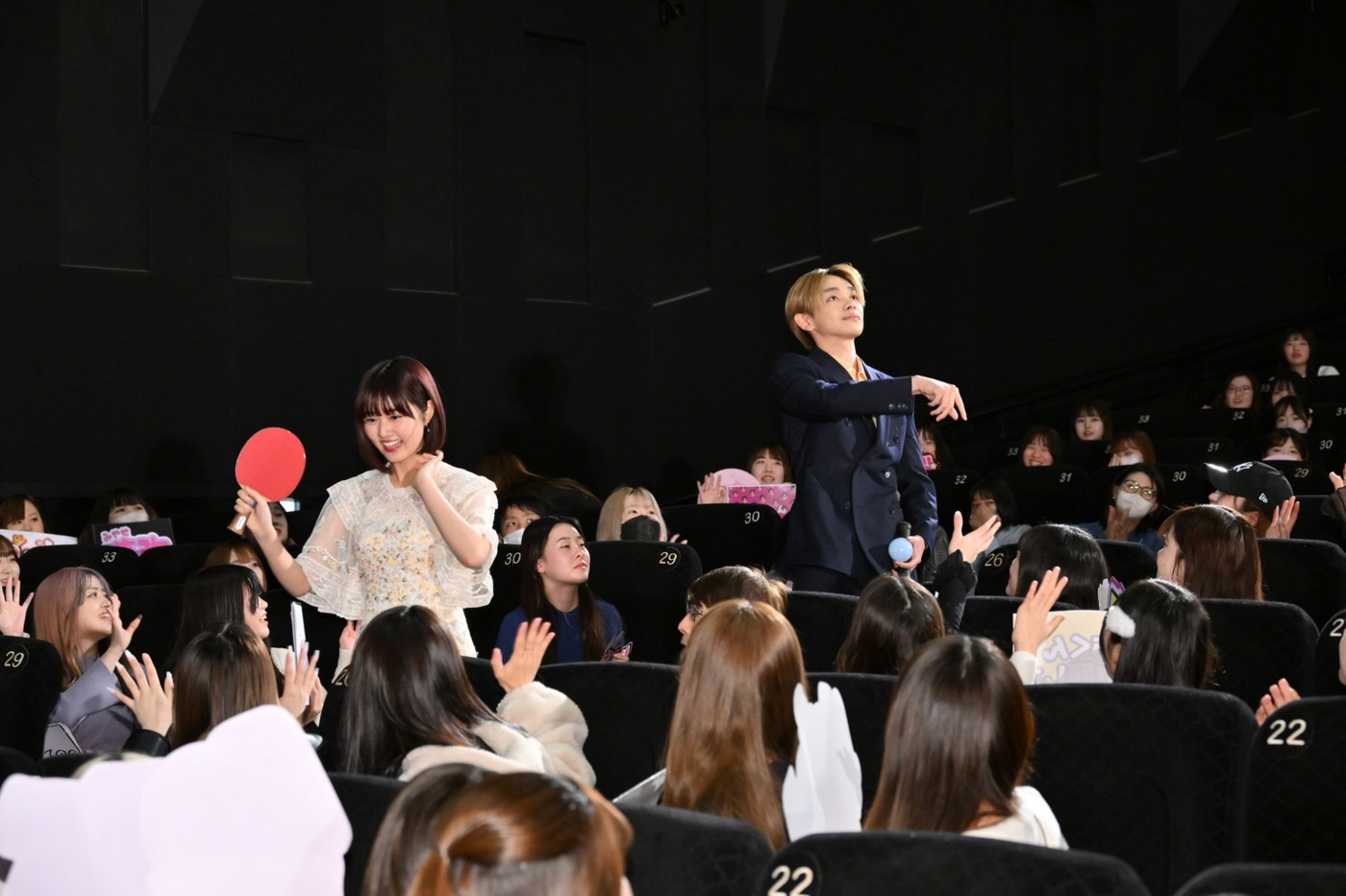 宮世と原が客席通路から登場すると、観客からは驚きいっぱいの黄色い歓声があがり、ふたりは大ヒットを支えてくれた観客へ感謝の気持ちを込めてサインボールをプレゼント。