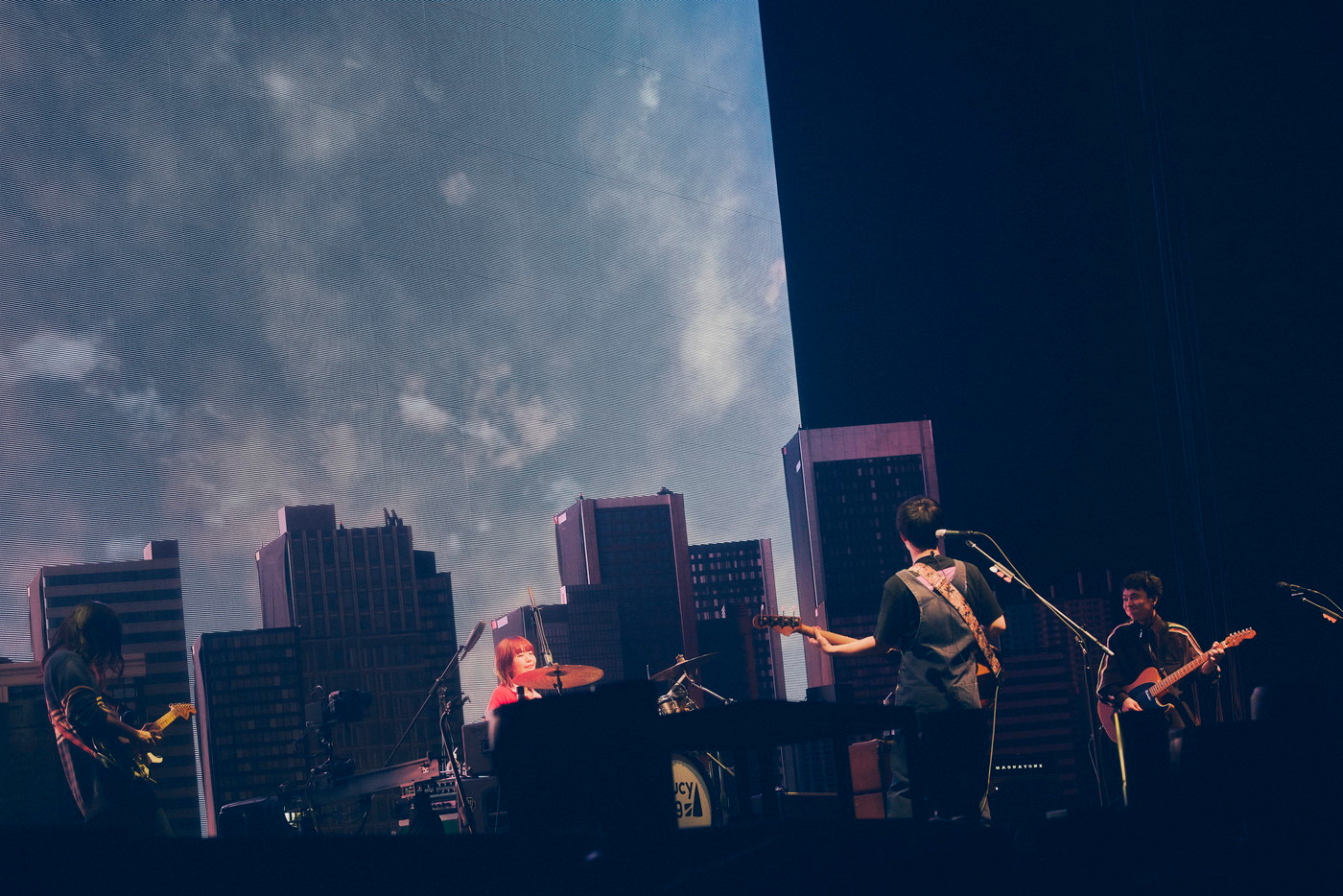 ステージをスモークが覆う幻想的なムードのなかで披露された「リスポーン」をエモーショナルに届けると、石原が「横浜!」と叫んで「現在を生きるのだ。」で一気に風景を押し広げる。そしてここでもシンガロングを巻き起こすと、立て続けに「夢みるスーパーマン」を投下する。
