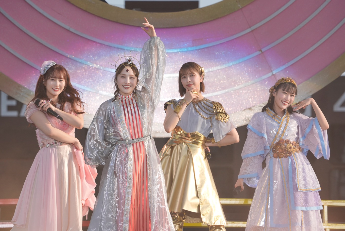 高城からの曲振りで、7thアルバム『イドラ』にも収録される「Brand New Day」を歌詞に合わせた振り付けや、4人揃って左右に動くダンスなど、爽やかにパフォーマンス。配信されて以降、本ライブが初披露となり、モノノフからも待望の歓声が上がった。次に「Chai Maxx」で、ファンにはお馴染みの特徴的な振り付けで、会場に一体感をもたらすと、本編最後の曲「上球物語 -Carpe diem-」へ。亀岡光秀まつりで大活躍だった、明智光秀と武者が再び登場。曲のラストでは、明智光秀がいきなり踊り始め、4人との息の合ったダンスを披露し、会場を沸かせたまま本編最後を締めくくった。明智光秀の思い描いた天下太平の世界を思う存分に表現したセットリストで駆け抜けた。