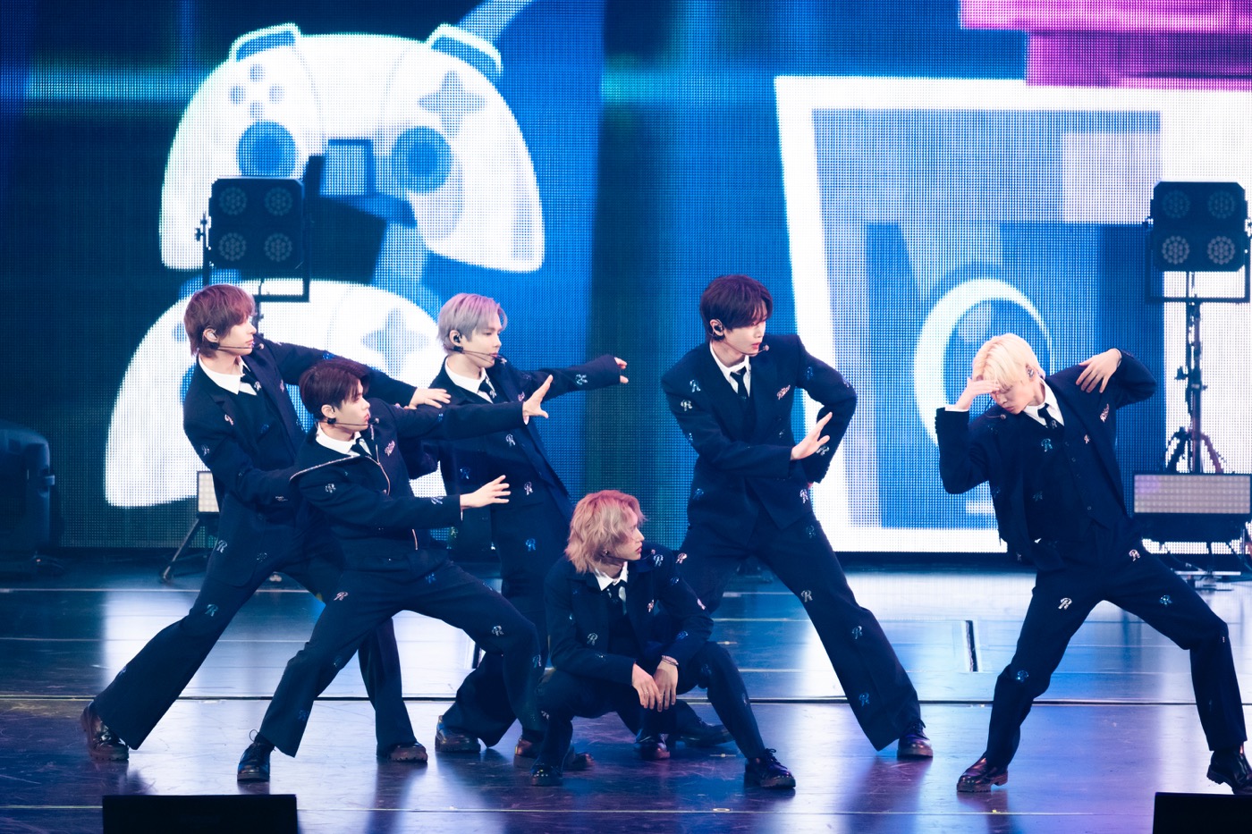 オープニングでオールラインナップのステージを終えRIIZEは6番目のアーティストとして、ネイビーの学生服ルックにRIIZEの“R”が全身に煌びやかに装飾された衣装でステージに登場した。