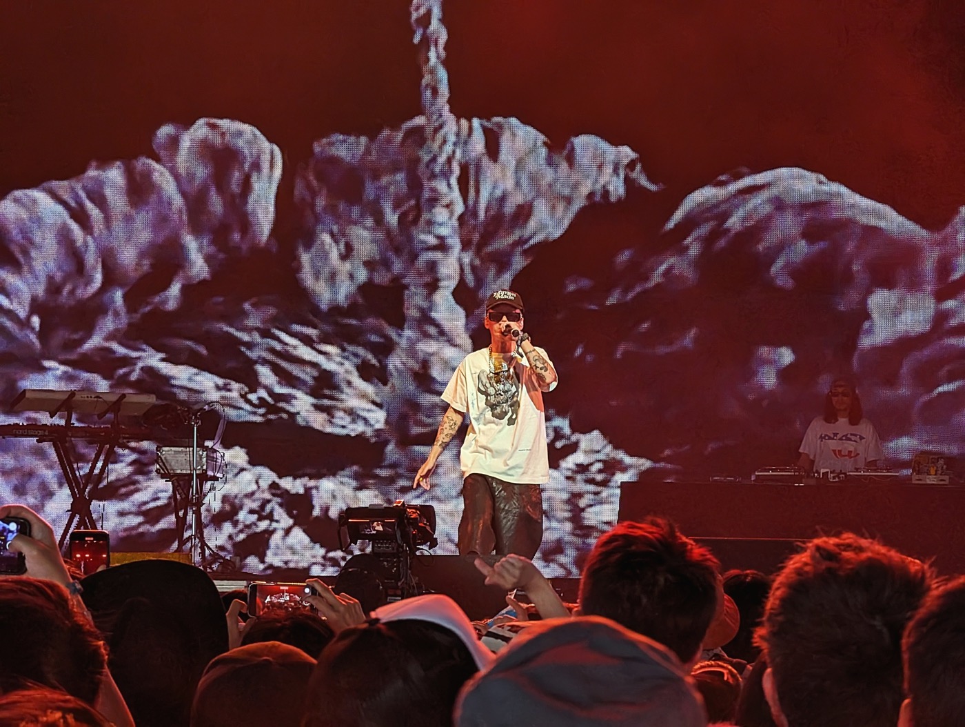 「コーチェラ、初めまして! 日本から来ました、A・w・i・c・h、Awichです!」と英語で自己紹介をすると、鋭い目つきと堂々たる姿勢でスタンバイ。「THE UNION」のクワイアが流れると大歓声が上がった。ルイ・ヴィトンから提供された衣装が風に吹かれて妖艶に舞い、夕日を背負って歌う彼女の姿はクイーンそのものだ。