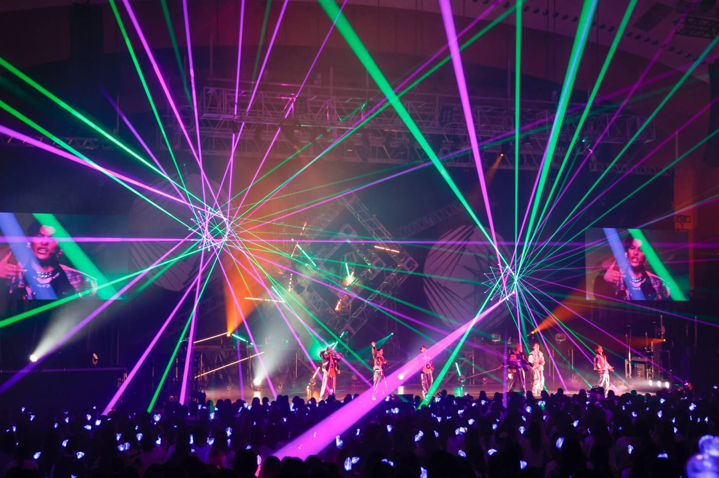 まさに夢か幻か? と思うような時間から再び一転。今度は世界で初の2台同時使用となる特殊レーザー・ビームツイスターが波のようにうごめきド派手な光の弧を空中に描き、蜘蛛の巣のように白い糸を場内に張ると、和柄×ラテンミックスのジャケットと銀箔押しのジーンズに着替えたHAYATO、KENSHIN、NAOYAのラッパー陣がステージに。この日のために作られた和風トラック「ALL OUT」に乗って、それぞれが自身で書き下ろしたラップ詞を歪んだ声でマシンガンのようにブチかましていく。