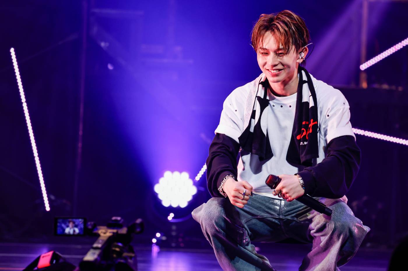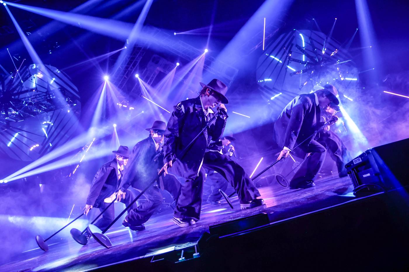 黒のハットをかぶり、それぞれにスタンドマイクを操る「QUEEN」では、ビームツイスターが鮮やかでゴージャスなライティングを織りなして、端正かつワイルドなダンディズムを存分にアピール。続く「What’s Your Favorite?」では大きく脚を上げて電飾の椅子にまたがり、時に愛しそうに抱きかかえるというなんともセクシーな振りつけにネクタイを放り投げて、会場を妖艶な色に染め上げていく。