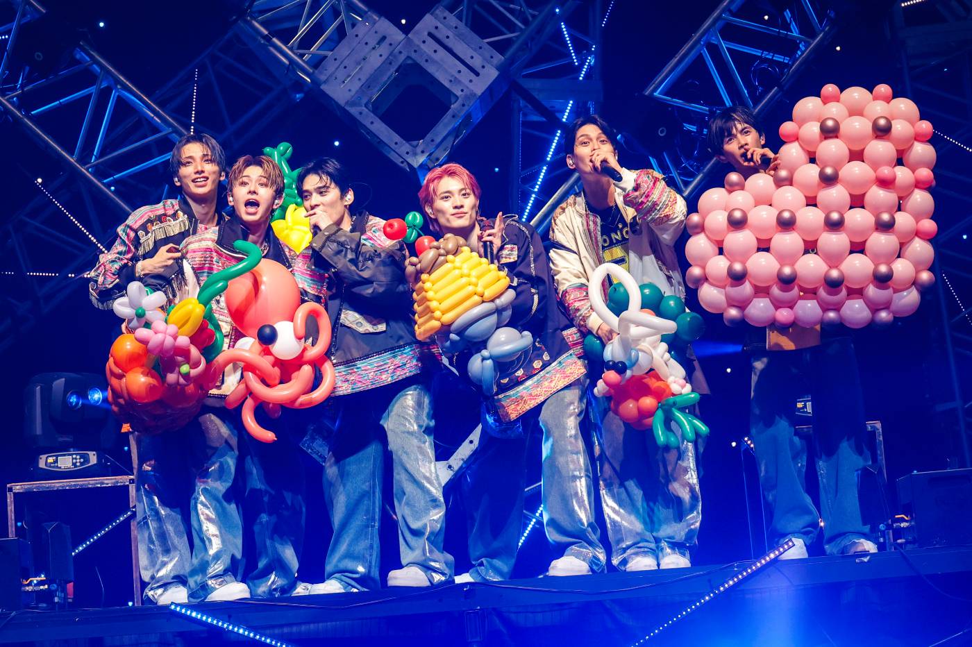 そのきらめく姿を表すかのように、シルバーに輝く球体が水泡のようにうねるオープニング映像が流れ、それとシンクロするように形を変えてうごめく舞台上のブースターバルーンが突然ステージを離れて客席上を飛翔。ざわめくSWAGたちの目前、壇上に並び立つ6人が噴き上がる炎をバックに登場すると、TETTAのパワフルな歌声から未発表の新曲「Fight or Die」が幕開けを告げる。