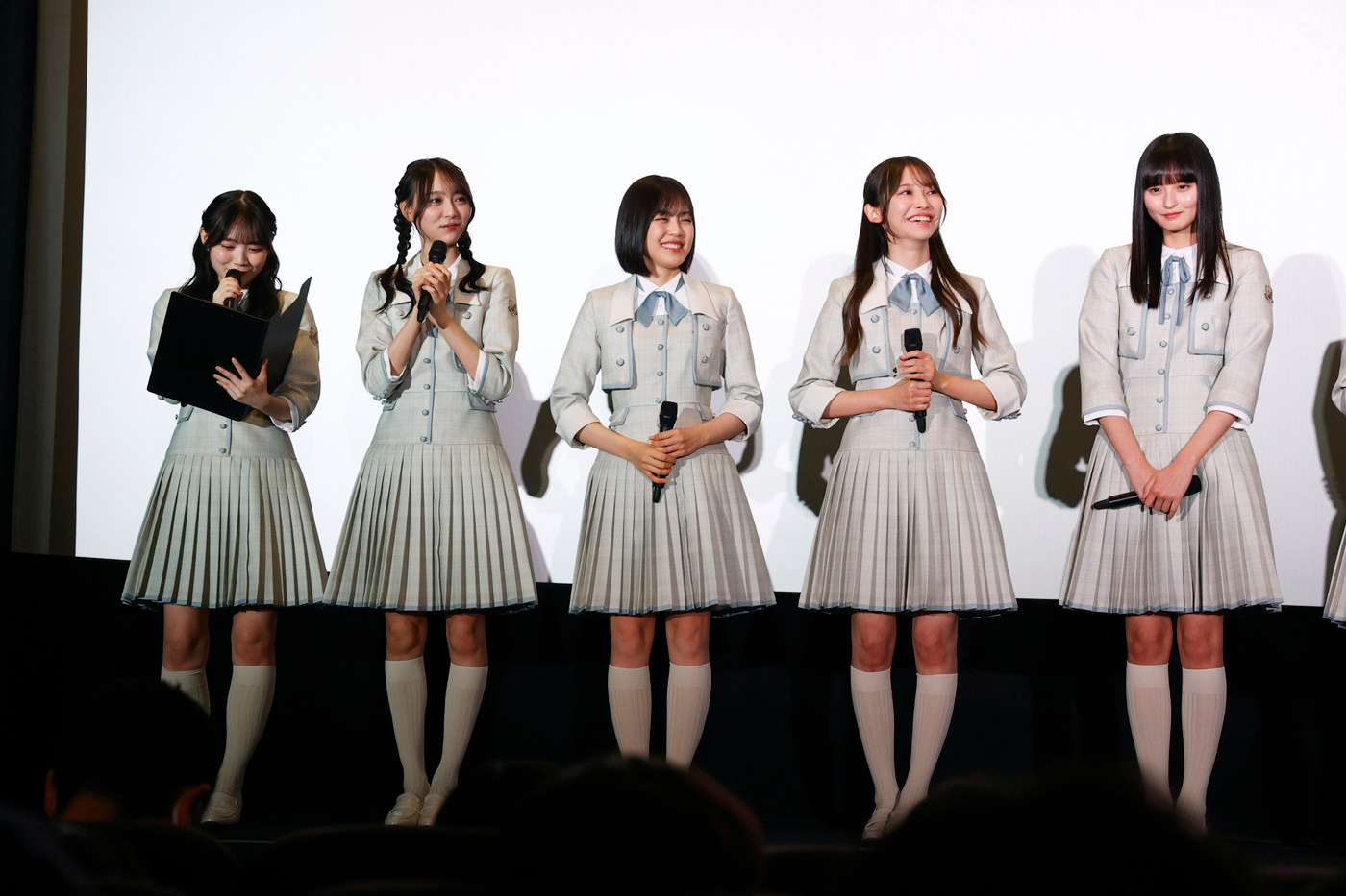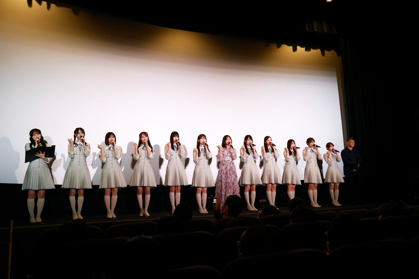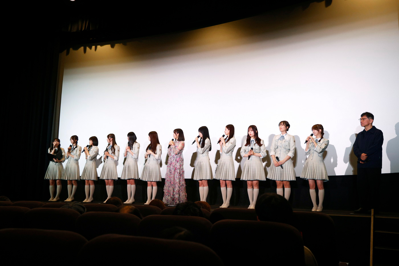 全員からの挨拶が終わり、最初の質問に答える前に、同期との再会と映画が完成したことへの想いが溢れ、思わず涙を流す北川悠理。田村真佑からも久々の再会がうれしいとの言葉があり、会場は温かな空気に包まれた。