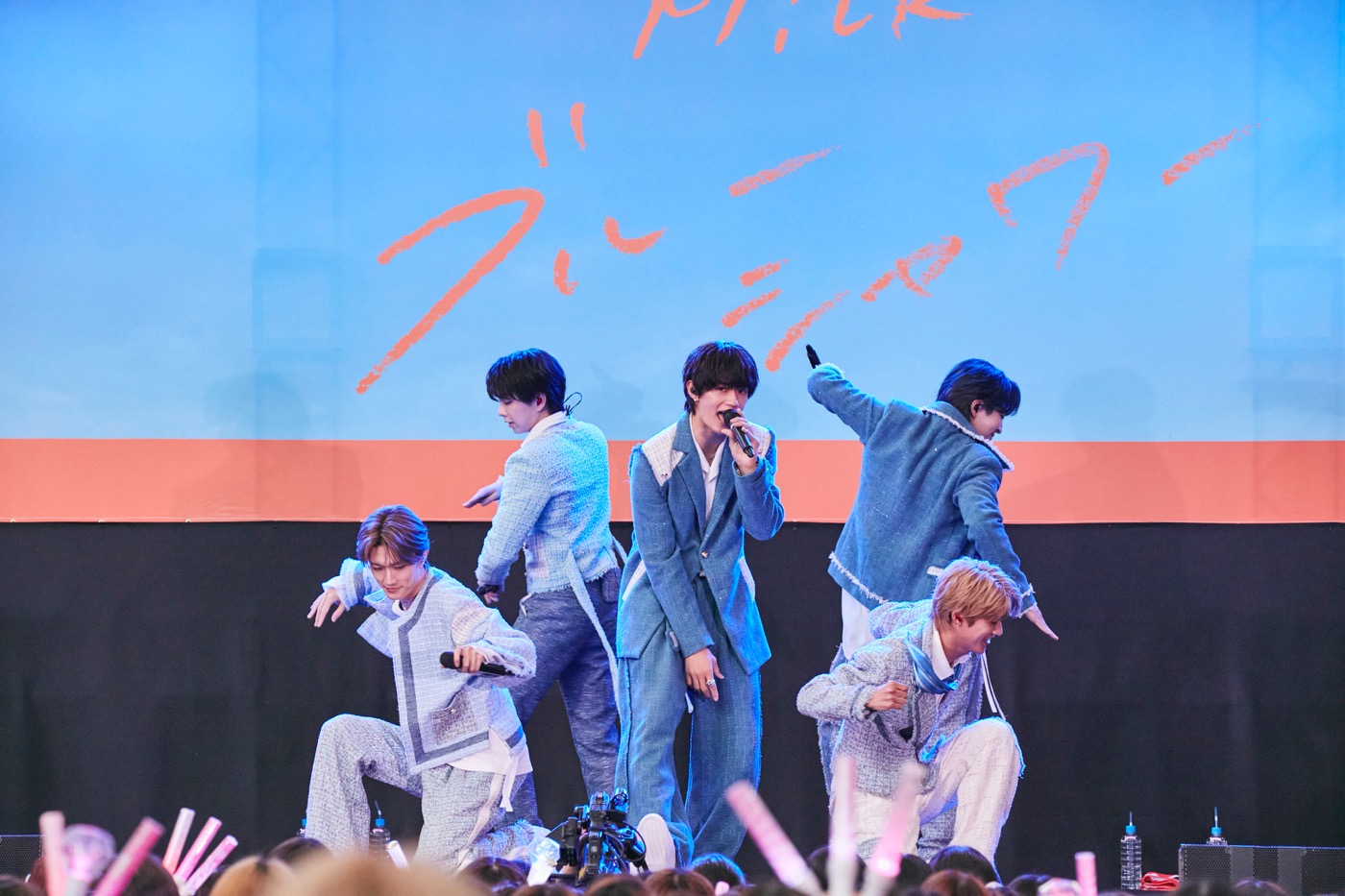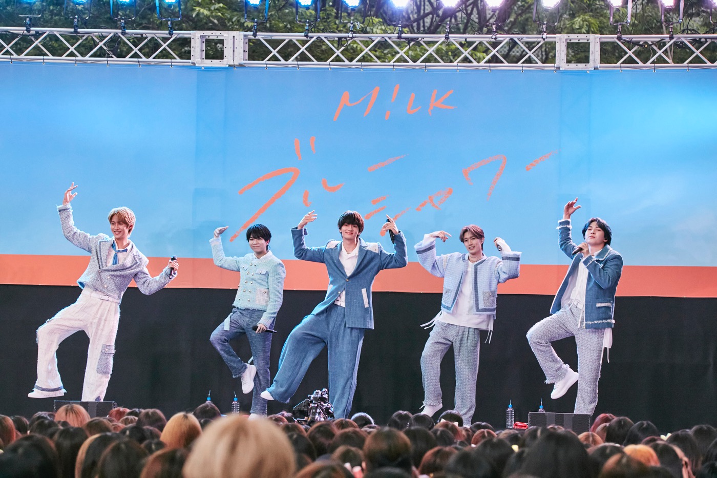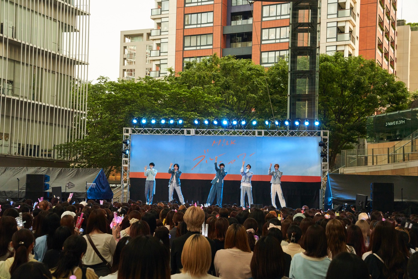 六本木ヒルズアリーナに設置された特設ステージに新衣装に身を包んだM!LKのメンバーが登場すると、オープンエアの心地よい空間に集結した1,000人を超える“み!るきーず(ファンの呼称)”は色とりどりのペンライトを振って迎えた。