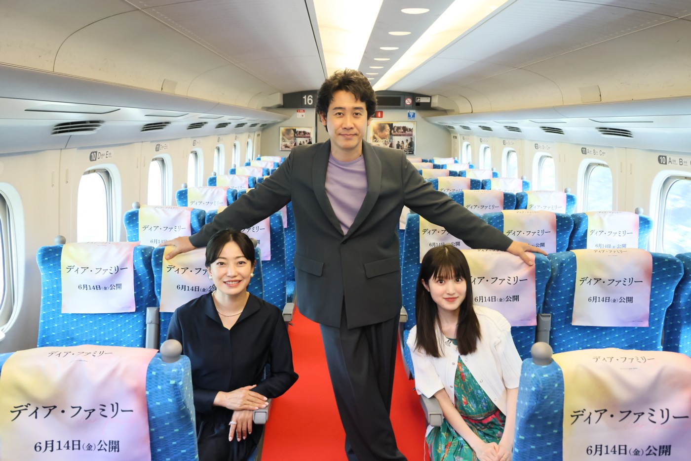 「最初で最後の!? 家族旅行」となる名古屋キャンペーン。まずは東京駅で3人で新幹線のぞみに乗車した。3人が乗ったのは『ディア・ファミリー』仕様となったスペシャルな車両。ヘッドカバーに映画ロゴが入ったり、レッドカーペットが敷かれたりと、この時だけの特別な新幹線での移動となり、3人とも感動した様子。「こんな風に特別仕様になっている車両は初めて見た!」「こんなに素敵に装飾してもらったのならお客さんにも見てもらいたい!」と語るなど、家族旅行さながらの盛り上がりのまま名古屋駅へと到着した。