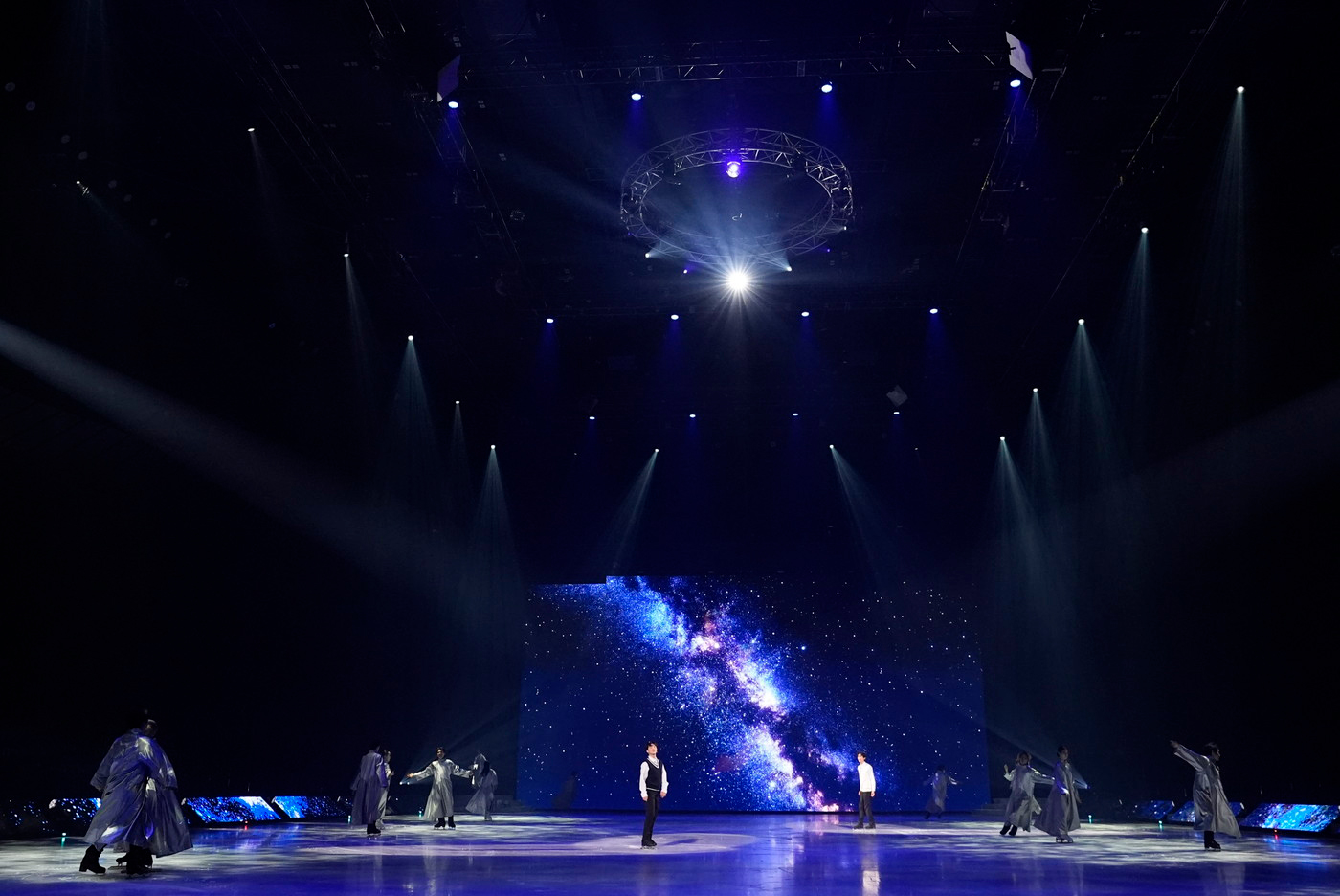 横浜アリーナのアリーナ部分が広大なアイスリンクステージとなり、正面に巨大なマルチスクリーン、左右と最前のリンクの端にも横長サイズのモニターが配置されシーンごとに様々な映像を映し出す。