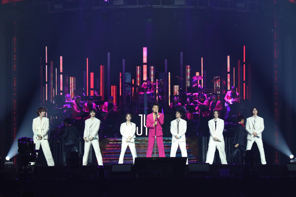 パク・ジニョンとの合同ステージも多くの見どころを残した。白いスーツを着たメンバーはパク・ジニョンと一緒にステージに上がり、彼のヒット曲「君だけだよ」を披露した。洗練された原曲にエキサイティングなパフォーマンス、メンバーのユーモラスな表情が加わり、1本のミュージカルのようなステージが完成した。
