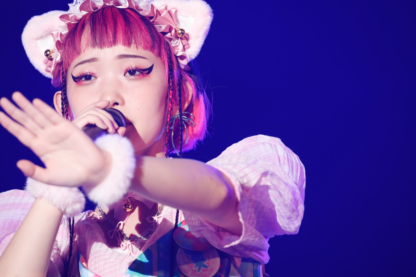 脈打つビートに呼応するようにハンドクラップが巻き起こる。そんな会場の客席から登場したのは、水曜日のカンパネラの詩羽。サプライズ演出に会場からは大きな歓声が上がる。詩羽は闊歩しながら「ティンカーベル」を歌いステージへ。ステージに上がると縦横無尽にパフォーマンス。恒例の「ディアブロ」での「いい湯だね!」コールも決まると、ボルテージは上昇。寸劇のように展開する「赤ずきん」でのオオカミの秀逸ダンス、「キャロライナ」で魅せた圧巻の詩羽の歌唱。水カンのライブは、楽しいも可愛いもカッコいいもすべて詰まっているから、素晴らしい。詩羽の好きなものを詰め込んだおもちゃ箱のようなステージ。「どうですか? 詩羽は?」という問いかけに「可愛い!」と声が上がる会場の中で、終始キュートに歌い踊り切った詩羽。代表曲「エンジソン」でこの日一番の歓声が上がると、最後には猫バルーンも登場し、みんなで万歳! 「愛してるよ!」とポップでカラフルなステージは幕を閉じた。