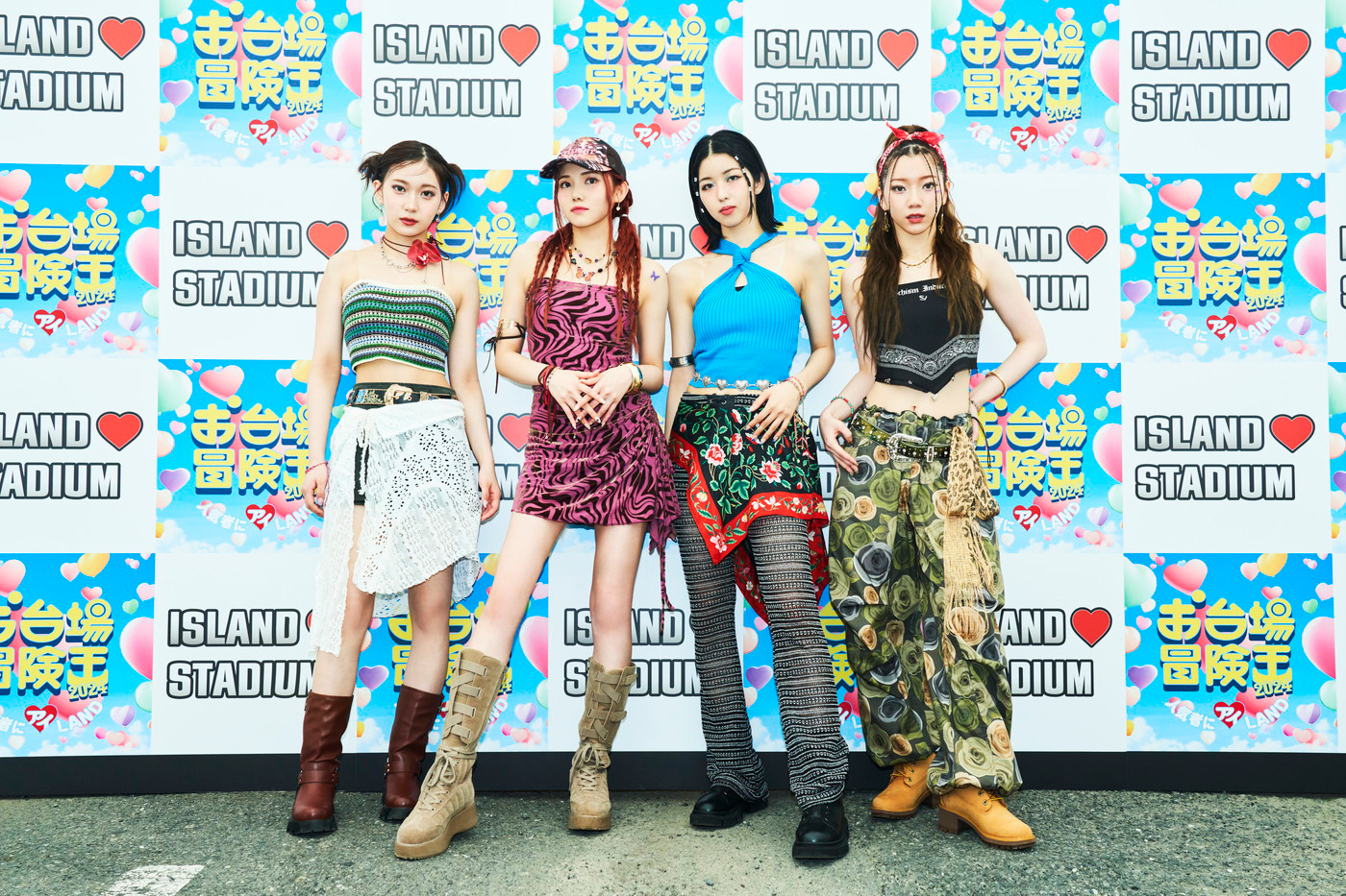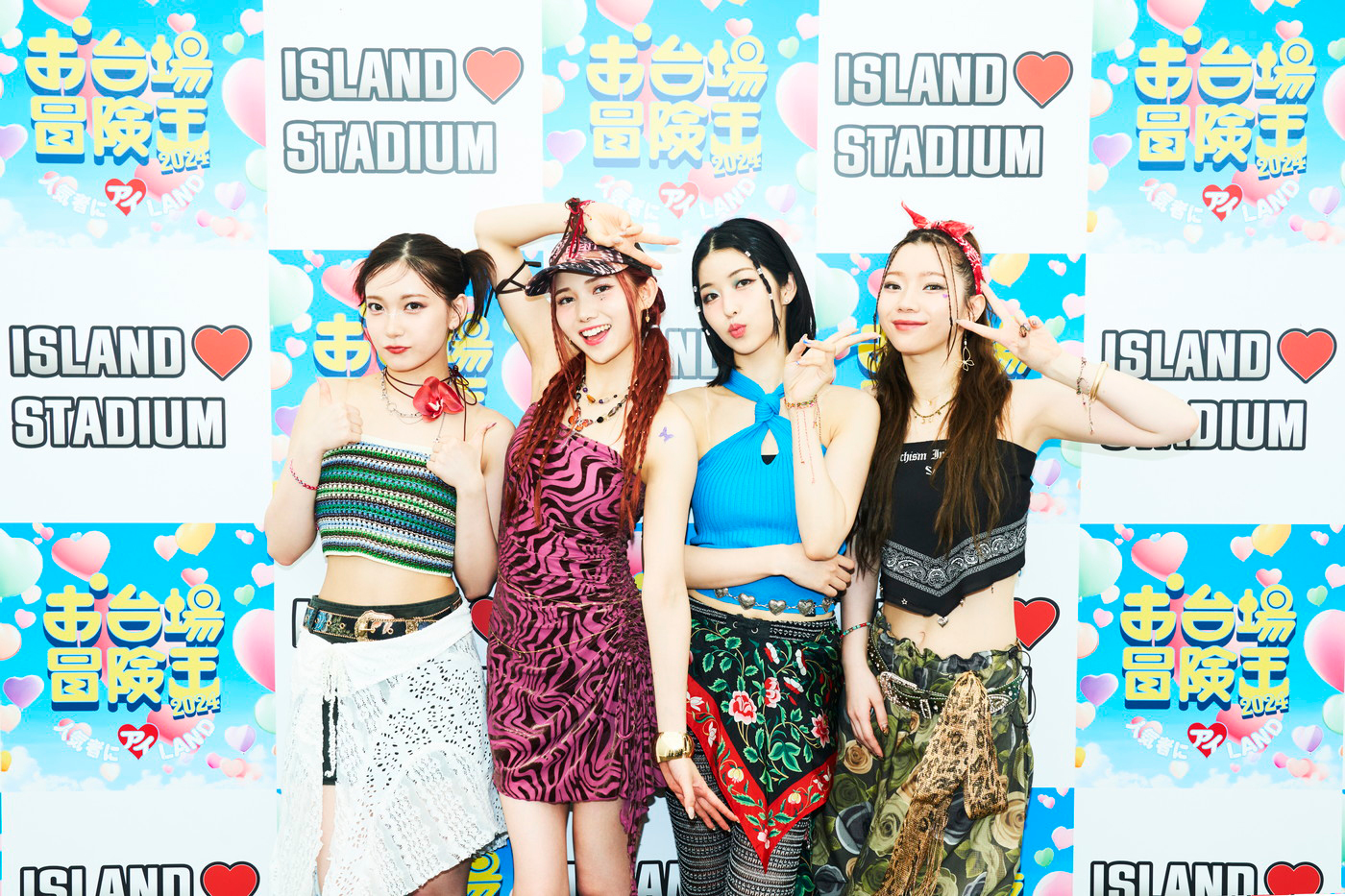 MCでの話題は夏のお祭りにちなんで好きな屋台について。YUUKIが焼きそば、RINOがじゃがバター、RINが焼き鳥、RINOがかき氷と回答。屋外特設会場「冒険ランド」のなかで販売されているかき氷やLE SSERAFIMのコラボパフェを本番前にみんなで食べていたとエピソードを話し、メンバーもしっかり満喫していたようだ。