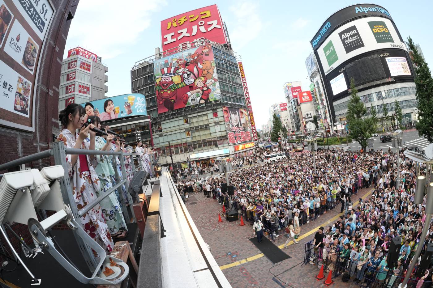 新宿ど真ん中での思いも掛けない水かけパフォーマンスにファミリーは大歓声。そのままの熱量で「えびぞりダイアモンド!!」でぶち上げ、ストリーミング総再生回数4,000万回を突破した最新アルバム『indigo hour』の収録曲で世界的大ヒット中のTVアニメ『マッシュル-MASHLE-神覚者候補選抜試験編』第2期エンディングテーマの「トーキョーズ・ウェイ!」、夏の定番ソング「ラブリースマイリーベイビー」といった人気曲が披露され、広場は瞬く間に賑やかなお祭りムードに。最後は「永遠に中学生」で締めくくられるとファミリーたちは一体となって熱狂し、ミニライブを楽しんだ。